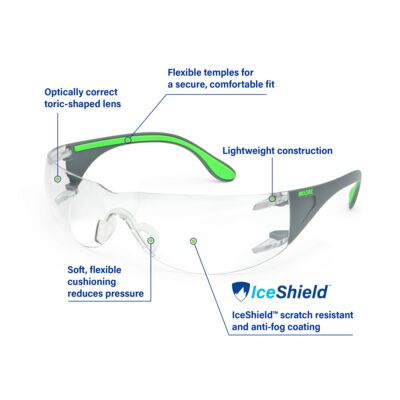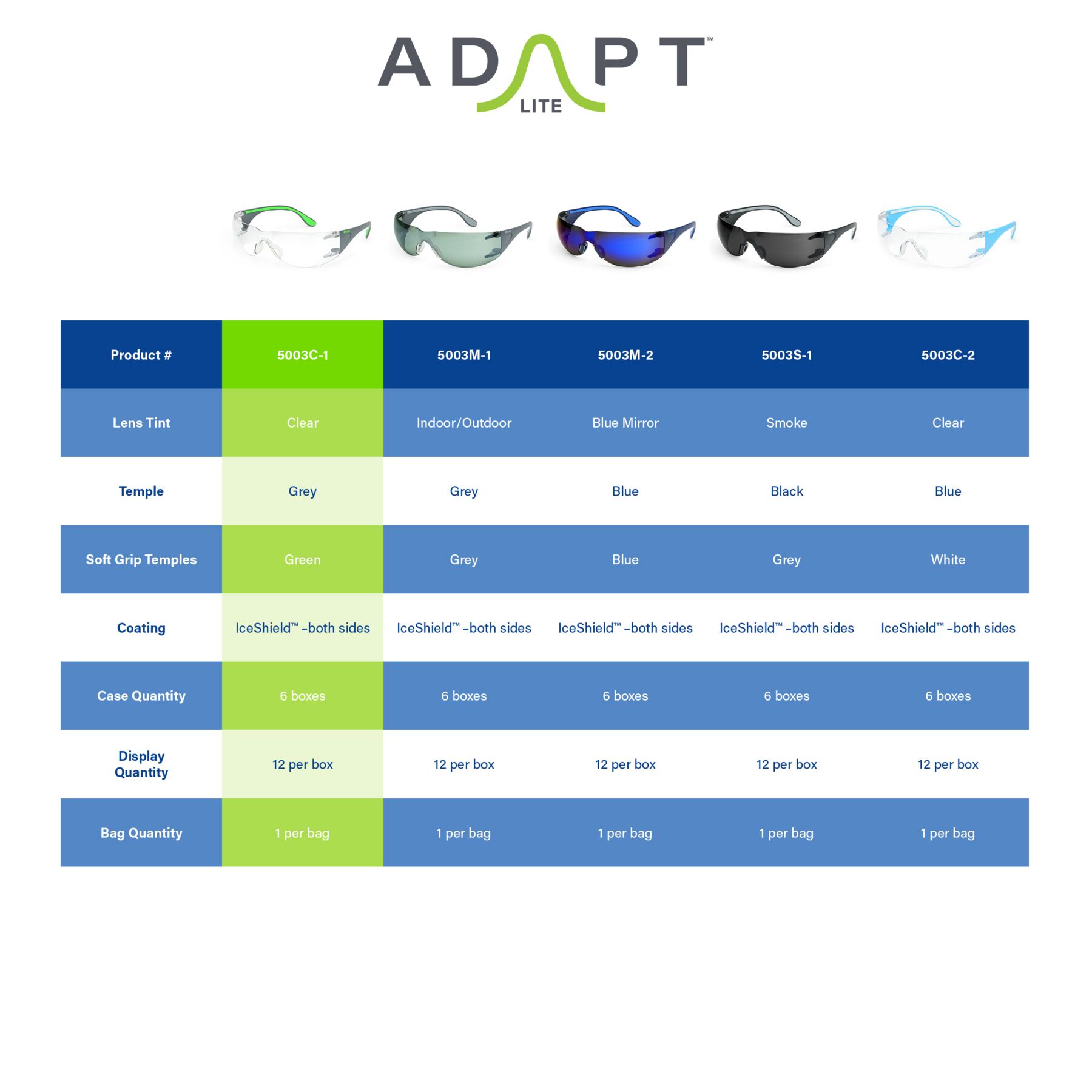 Meet Adapt™ Lite 5003C-1, safety glasses engineered for lightweight performance and all-day comfort. IceShield™, our scratch-resistant, anti-fog, and UV-protective coating, works immediately — no activation or treatments required — helping reduce fogging caused by warm breath, humidity, and temperature changes while helping support clear, distortion-free vision. The optically correct toric lens shape delivers a closer, more contoured fit, while reduced lens dimensions create added space in the nose bridge area for comfortable wear with respirators. A soft, flexible nose cushion helps reduce pressure and enhances stability throughout the workday, and flexible, soft-grip temples help keep the fit secure without added weight. Designed for demanding work environments, Adapt™ Lite meets ANSI Z87.1, CSA Z94.3, and AS/NZS 1337.1 standards.