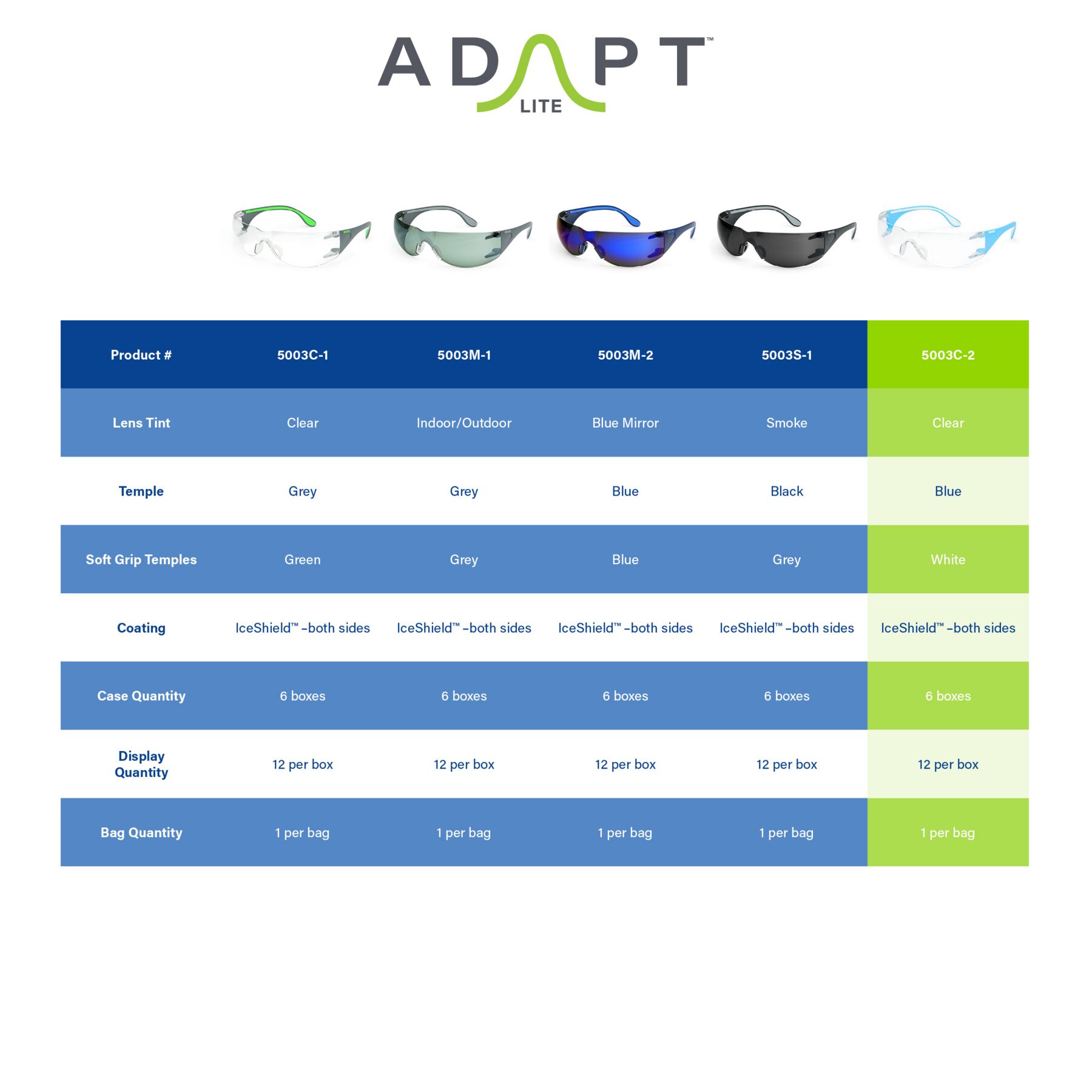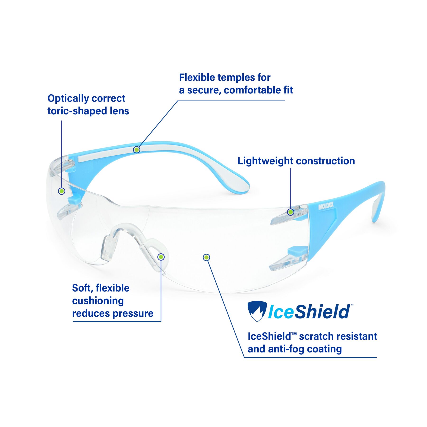 Meet Adapt™ Lite 5003C-2, safety glasses engineered for lightweight performance and all-day comfort. Part of our Frontline™ by Moldex® collection, these are designed with healthcare professionals in mind. IceShield™, our scratch-resistant, anti-fog, and UV-protective coating, works immediately — no activation or treatments required — helping reduce fogging caused by warm breath, humidity, and temperature changes while helping support clear, distortion-free vision. The optically correct toric lens shape delivers a closer, more contoured fit, while reduced lens dimensions create added space in the nose bridge area for comfortable wear with respirators. A soft, flexible nose cushion helps reduce pressure and enhances stability throughout the workday, and flexible, soft-grip temples help keep the fit secure without added weight. Designed for demanding work environments, Adapt™ Lite meets ANSI Z87.1, CSA Z94.3, and AS/NZS 1337.1 standards.