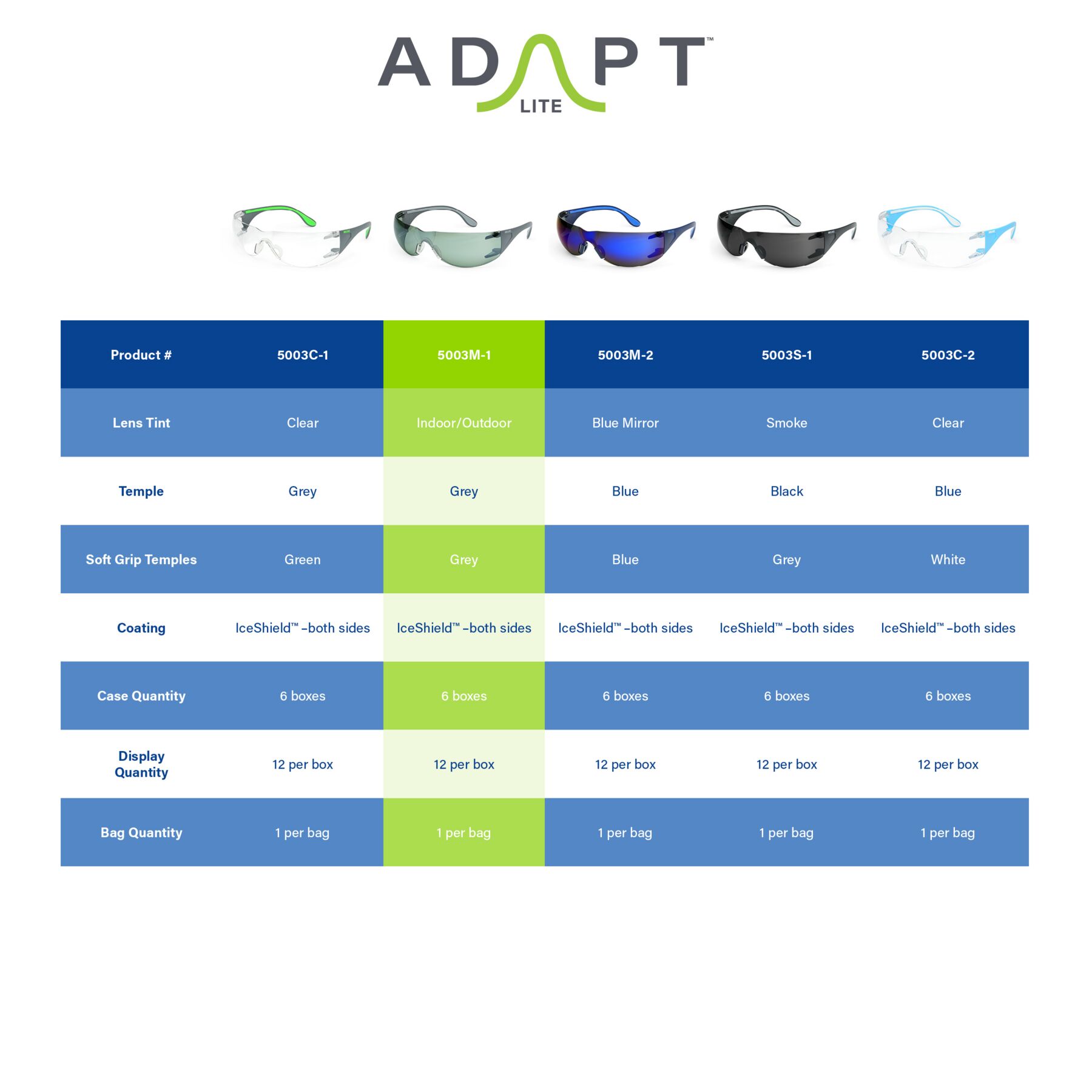 Meet Adapt™ Lite 5003M-1, safety glasses engineered for lightweight performance and all-day comfort. The Indoor/Outdoor lens helps manage glare in mixed lighting conditions, supporting visual comfort in both indoor and outdoor environments. IceShield™, our scratch-resistant, anti-fog, and UV-protective coating, works immediately — no activation or treatments required — helping reduce fogging caused by warm breath, humidity, and temperature changes while helping support clear, distortion-free vision. The optically correct toric lens shape delivers a closer, more contoured fit, while reduced lens dimensions create added space in the nose bridge area for comfortable wear with respirators. A soft, flexible nose cushion helps reduce pressure and enhances stability throughout the workday, and flexible, soft-grip temples help keep the fit secure without added weight. Designed for demanding work environments, Adapt™ Lite meets ANSI Z87.1, CSA Z94.3, and AS/NZS 1337.1 standards.