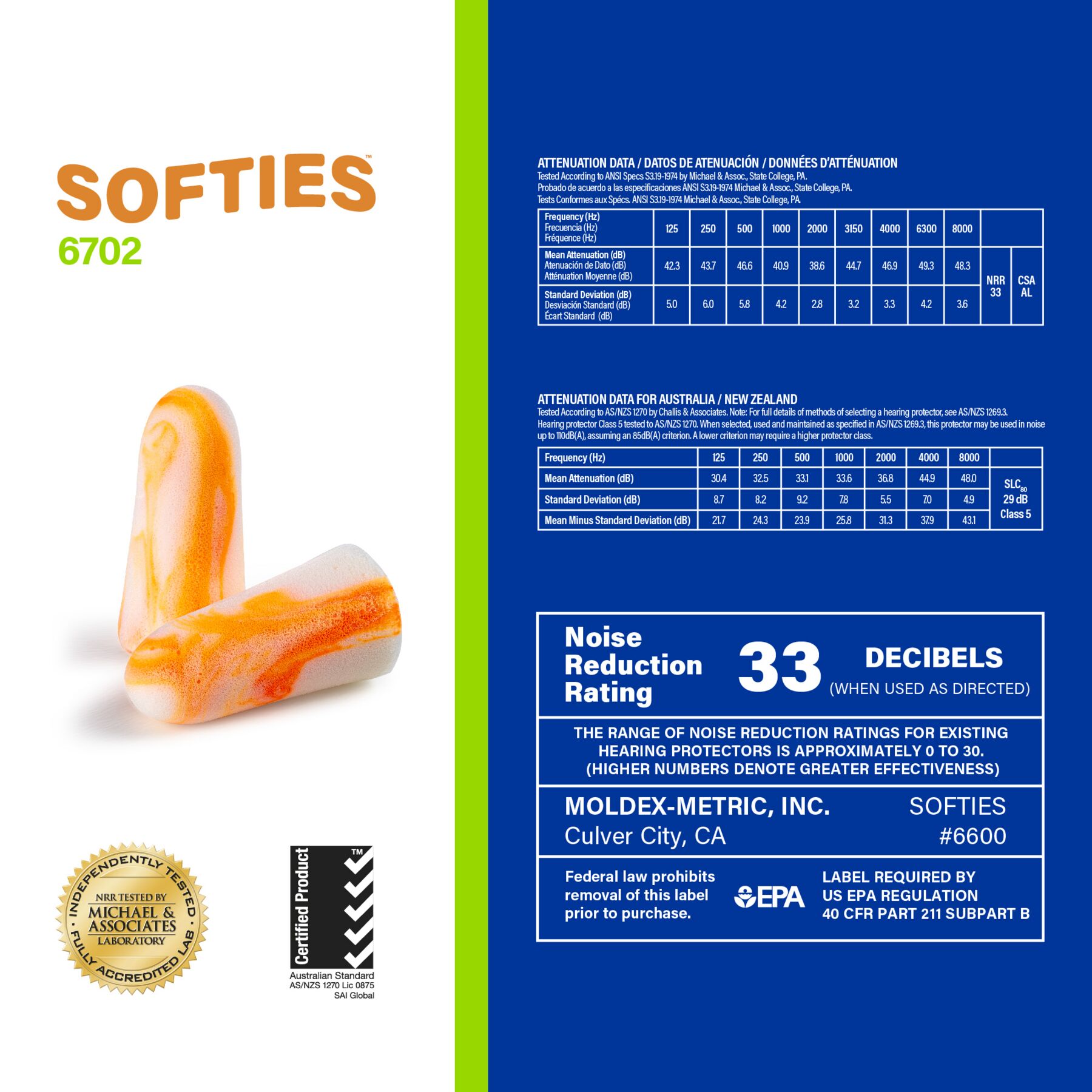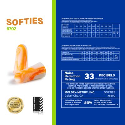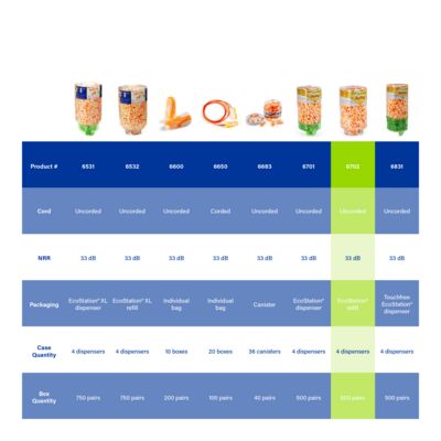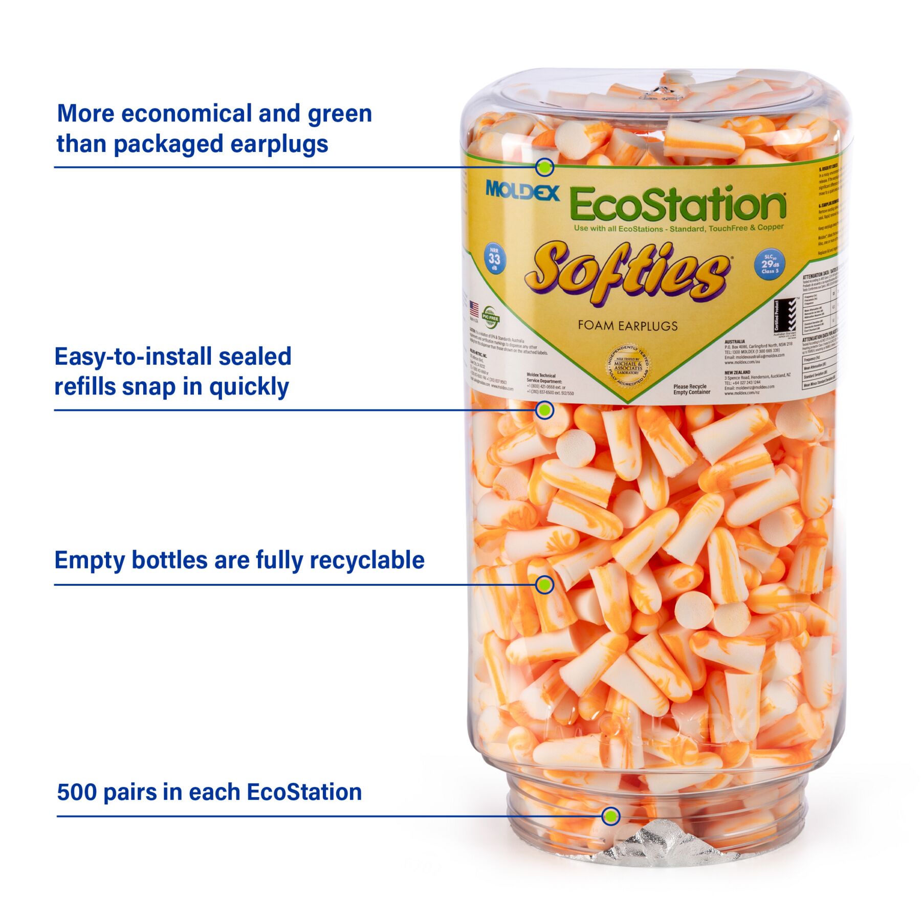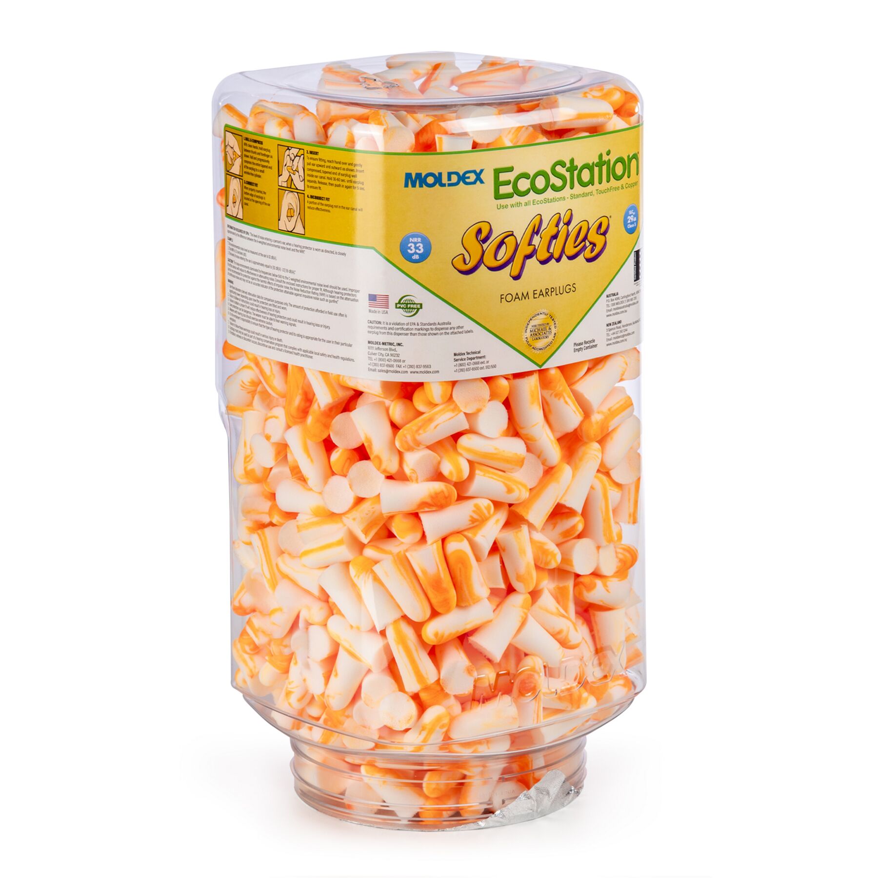 Softies® EcoStation REFILL, 500 pairs per dispenser More cost-effective and hygienic than other earplug dispensers. SNAP-IN REFILLS are available for the fastest and easiest changeover. 100% recyclable dispenser. Softies® are made of extra-soft, extra-light foam. Their tapered shape fits easily in the ear canal. Softies® seal snugly without uncomfortable pressure. Their outer surface is smooth, so it doesn’t irritate the ear canal. HIGHEST INDEPENDENTLY TESTED NRR 33 EARPLUGS Made in America.