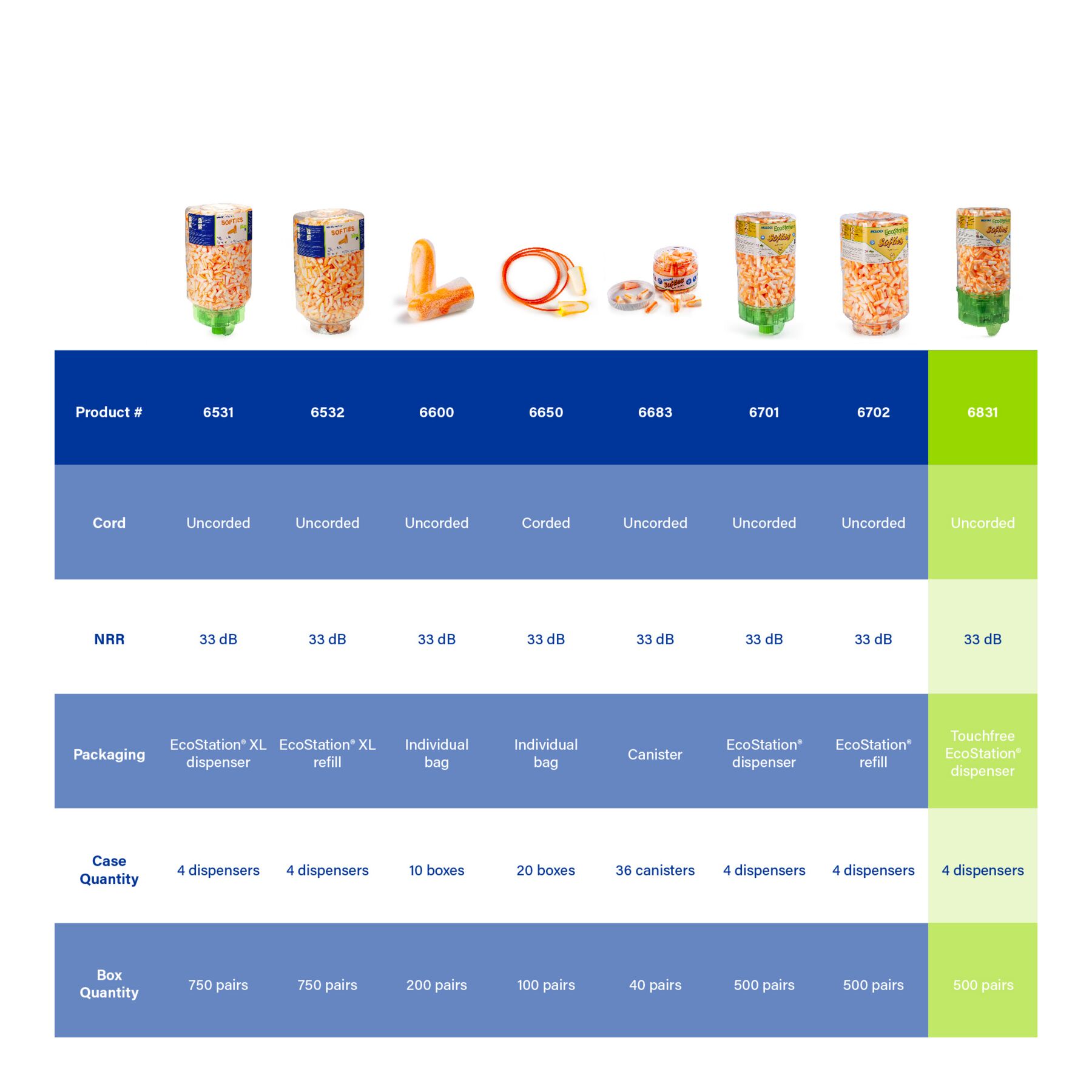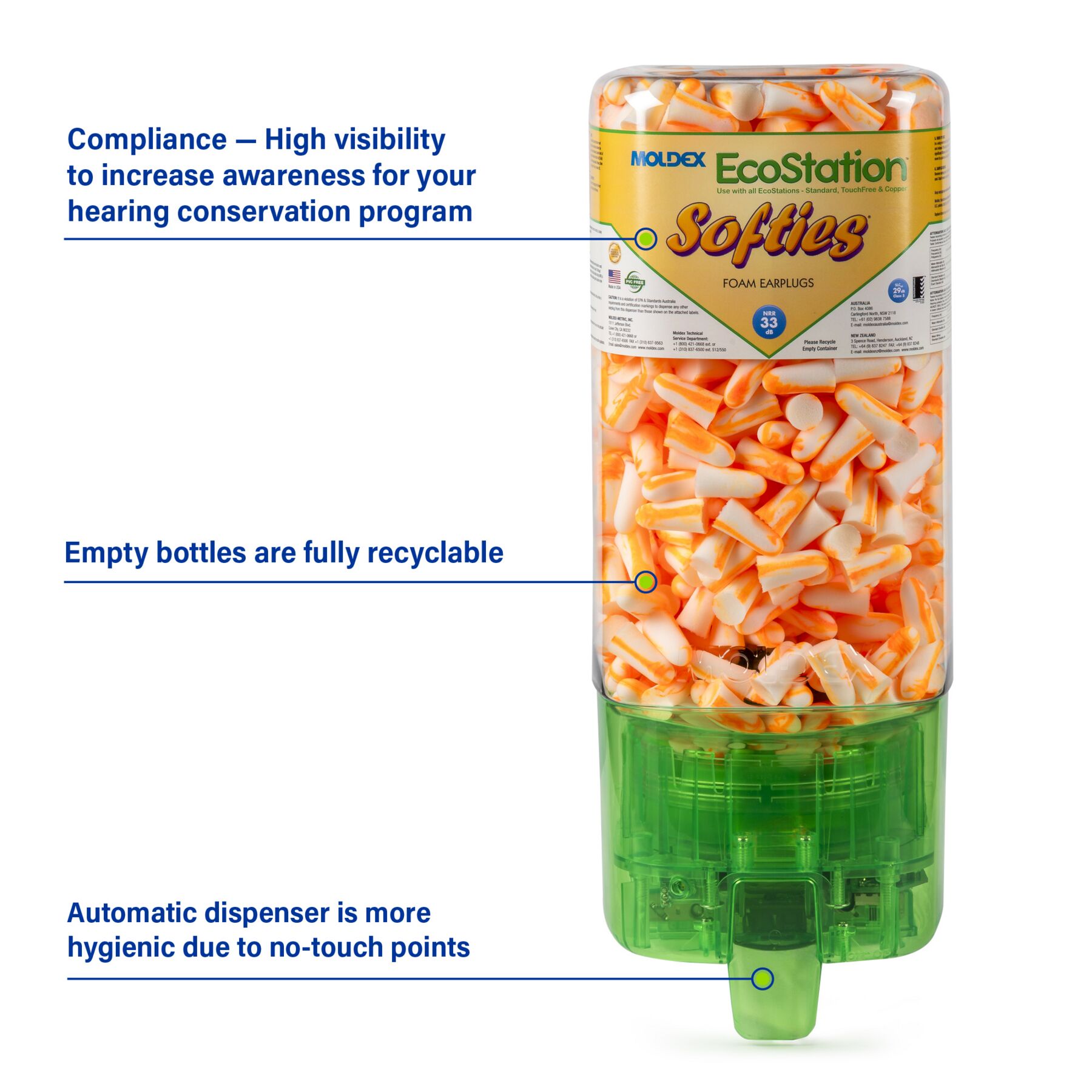 Softies® TouchFree EcoStation comes with one 500 pairs More cost-effective and hygienic than other earplug dispensers. SNAP-IN REFILLS are available for the fastest and easiest changeover. 100% recyclable dispenser. Softies® are made of extra-soft, extra-light foam. Their tapered shape fits easily in the ear canal. Softies® seal snugly without uncomfortable pressure. Their outer surface is smooth, so it doesn’t irritate the ear canal. HIGHEST INDEPENDENTLY TESTED NRR 33 EARPLUGS