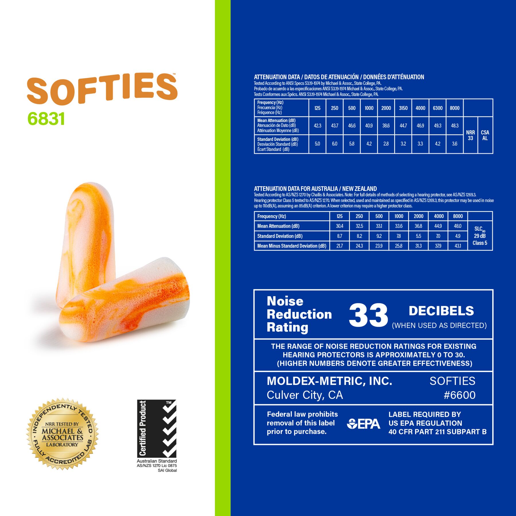 Meets ANSI S3.19 1974, Method for Measurement of Real-Ear Protection of Hearing Protectors and Physical Attenuation of Earmuffs, Meets AS/NZS 1270:2002, Acoustics-Hearing Protectors