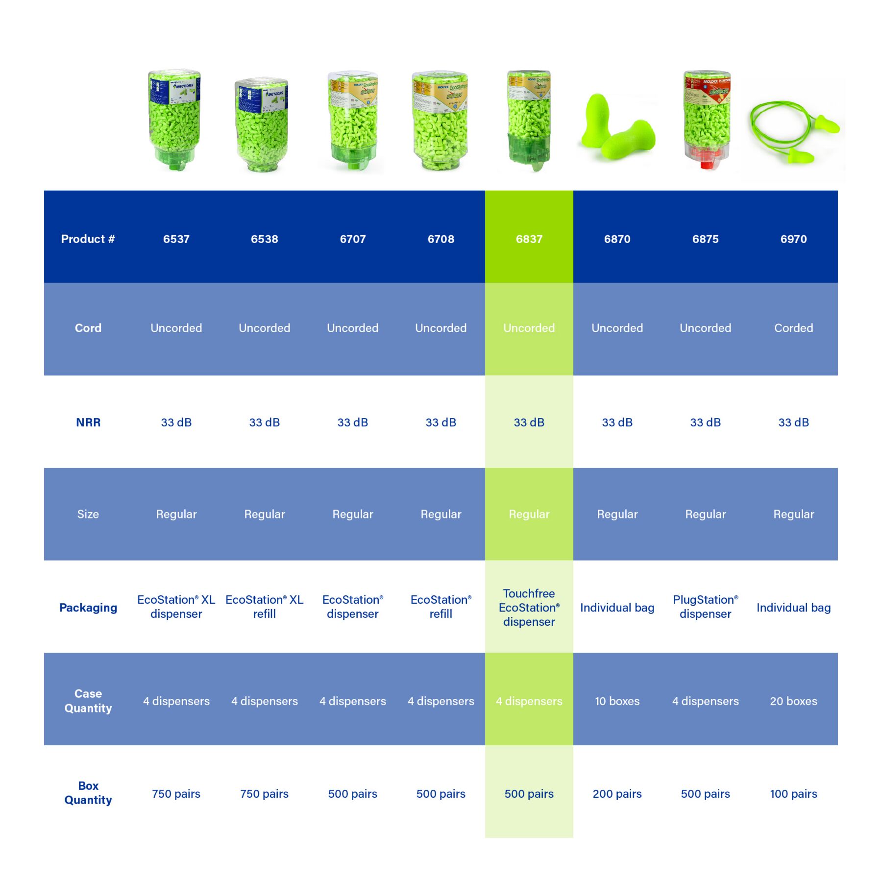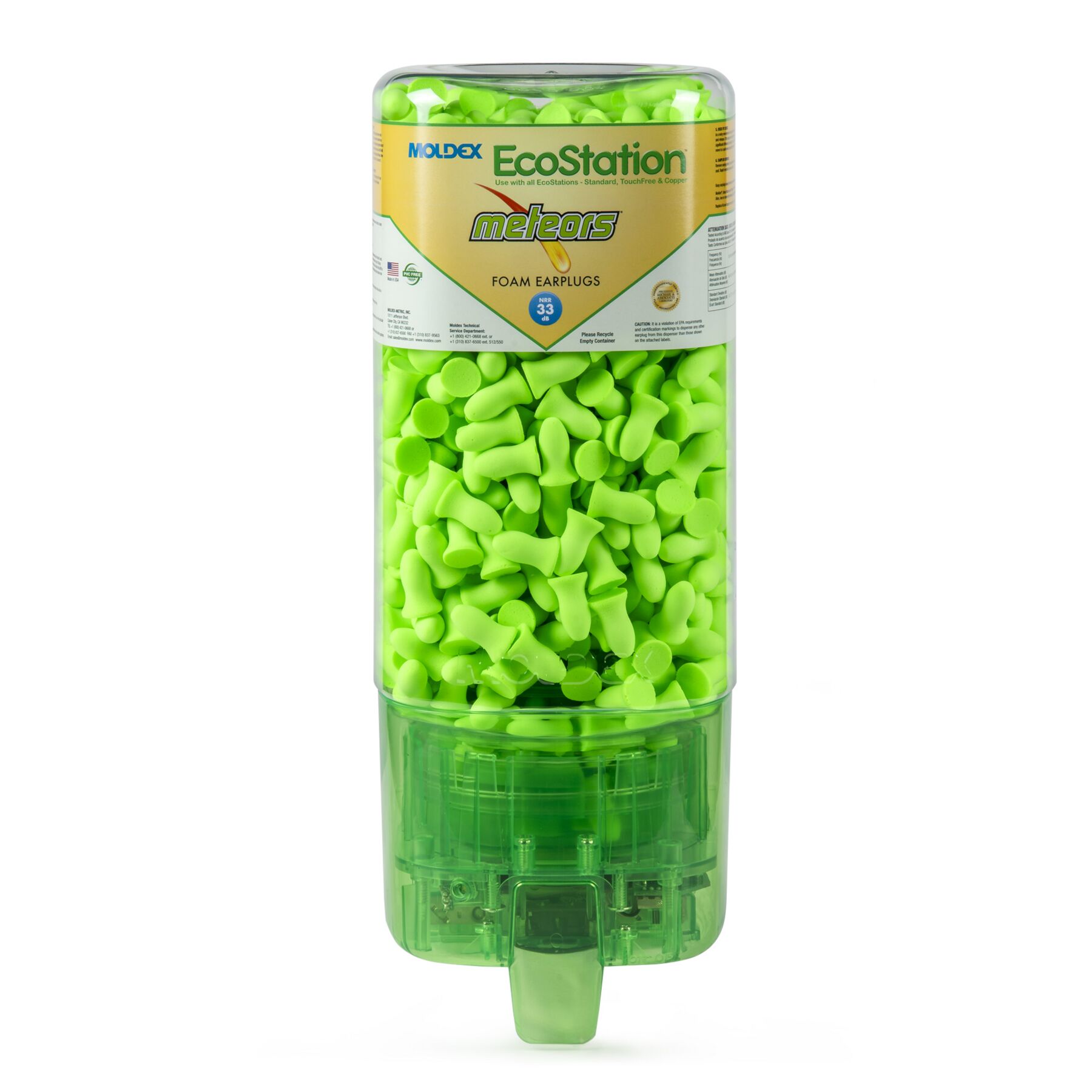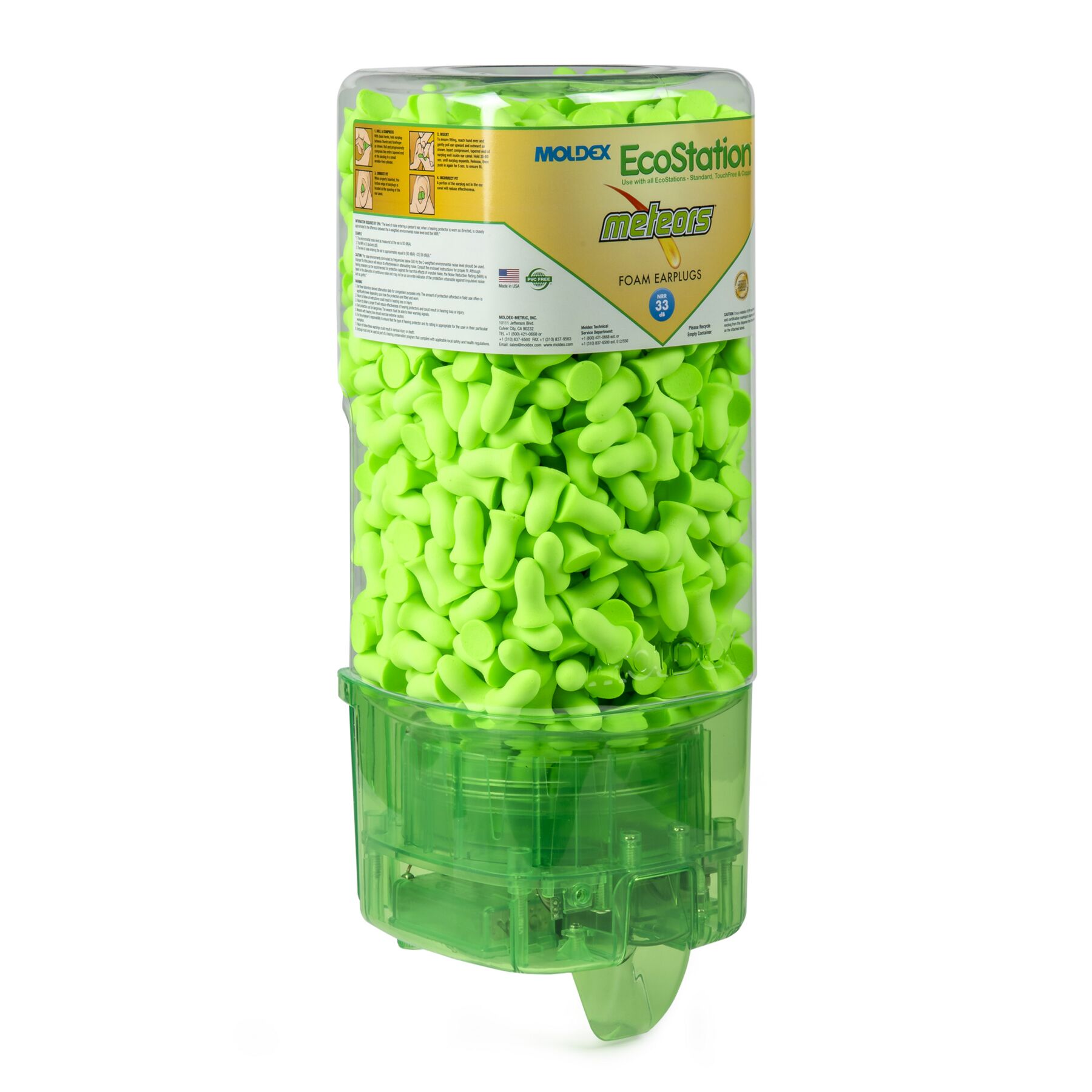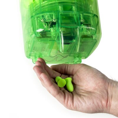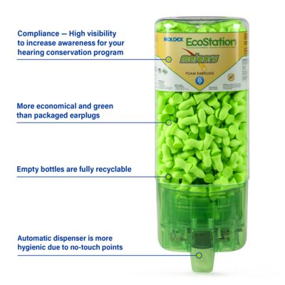Meteors®TouchFree EcoStation Dispenser with 500 pairs per dispenser HYGIENIC FROM DISPENSER TO YOUR HAND Earplugs drop a pair at a time into workers’ hands, so you don’t have to worry about plugs falling on the floor or trays collecting dust and contaminants. When the EcoStation is empty simply dispose of it in the recycle bin and replace with an easy to install refill. INCREASED COMPLIANCE AND COST SAVINGS Convenient, quick access and ease of use for more compliance. Plus, workers take only one pair at a time, so there is less waste. Less waste means more cost savings. Lower cost per pair than packaged earplugs. SNAP-IN REFILL Easy to install refill, snaps in quickly, for fast changeover. The sealed refill helps prevent contamination. Empty EcoStation containers are also 100% recyclable. Made in America