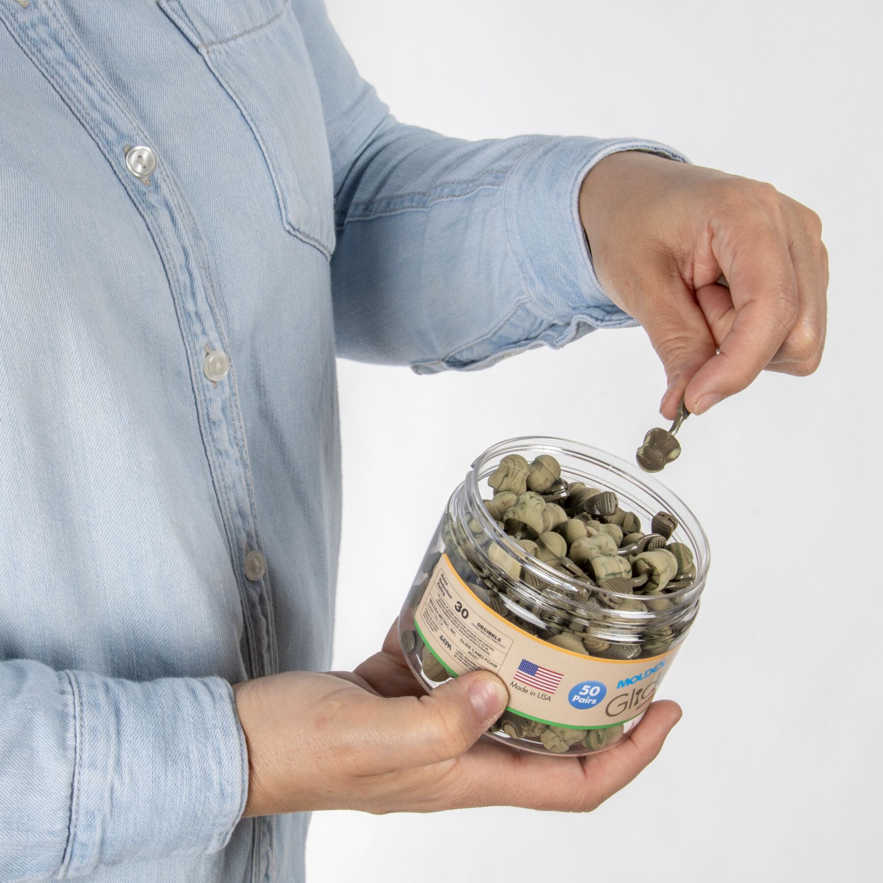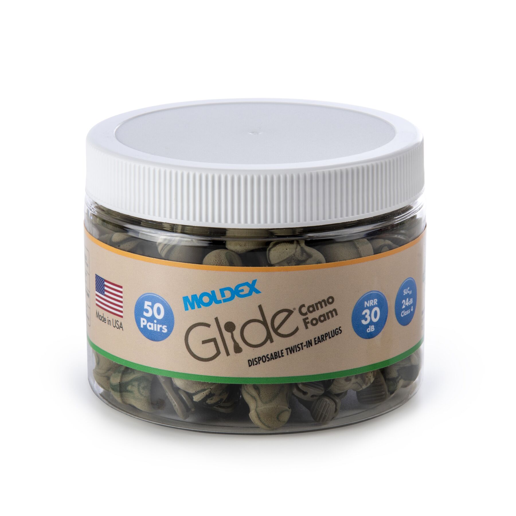 Meet Moldex® Glide® Camo Foam Earplugs 6687 in a jar , push-and-twist hearing protection designed for fast use in demanding work environments. Featuring a patented Twist-In design, Glide® earplugs let workers simply push and twist for a custom fit—no roll-down required—making them ideal for dirty hands or gloved use. Independently tested to an NRR of 30 dB, the soft camo foam pod and innovative multi-curved stem work together to deliver noise reduction and a comfortable seal that supports consistent wear and improved compliance. Glide® Camo Foam earplugs are 100% Made in the USA.
