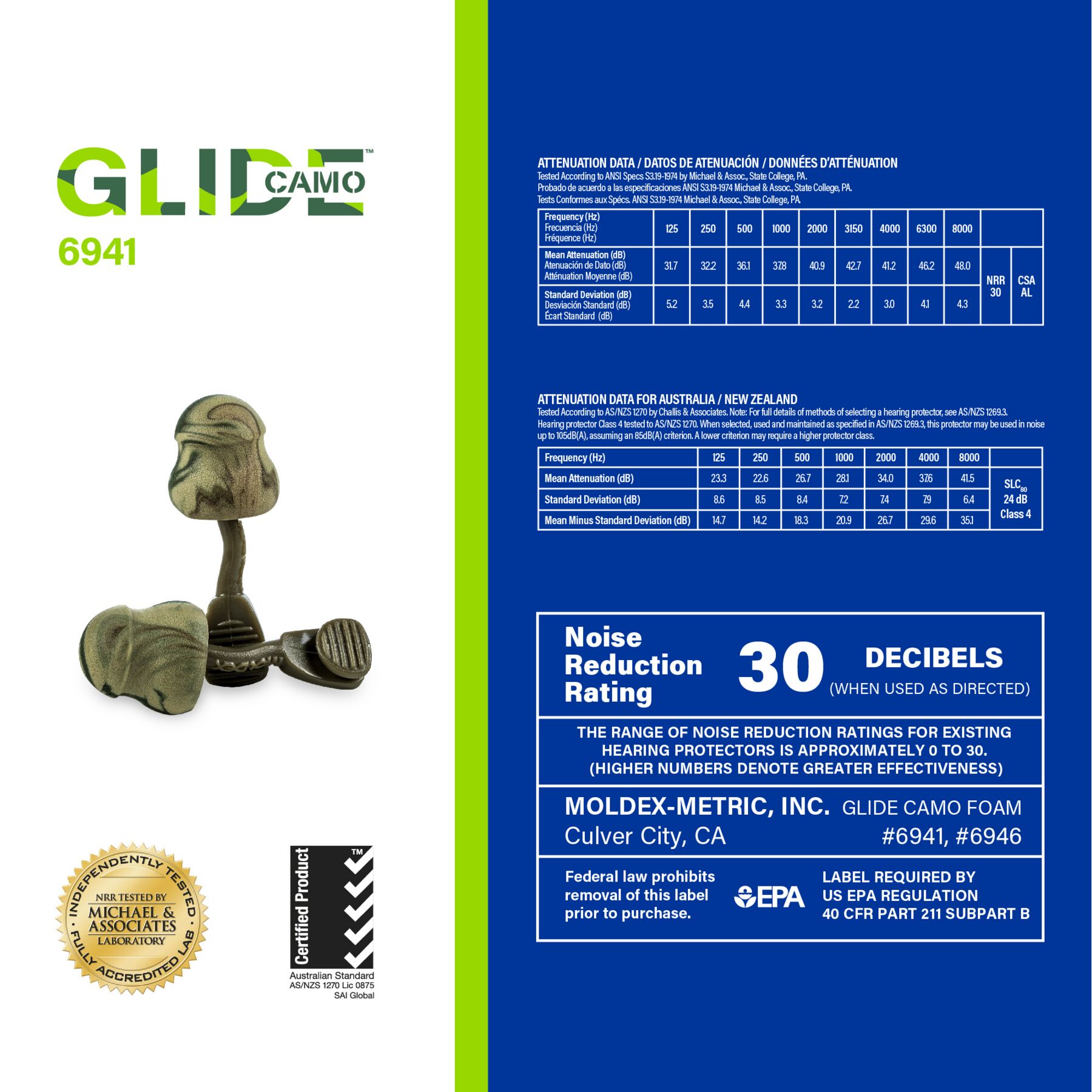 Moldex Glide® Uncorded Camo Foam Earplug 6941, NRR 30dB