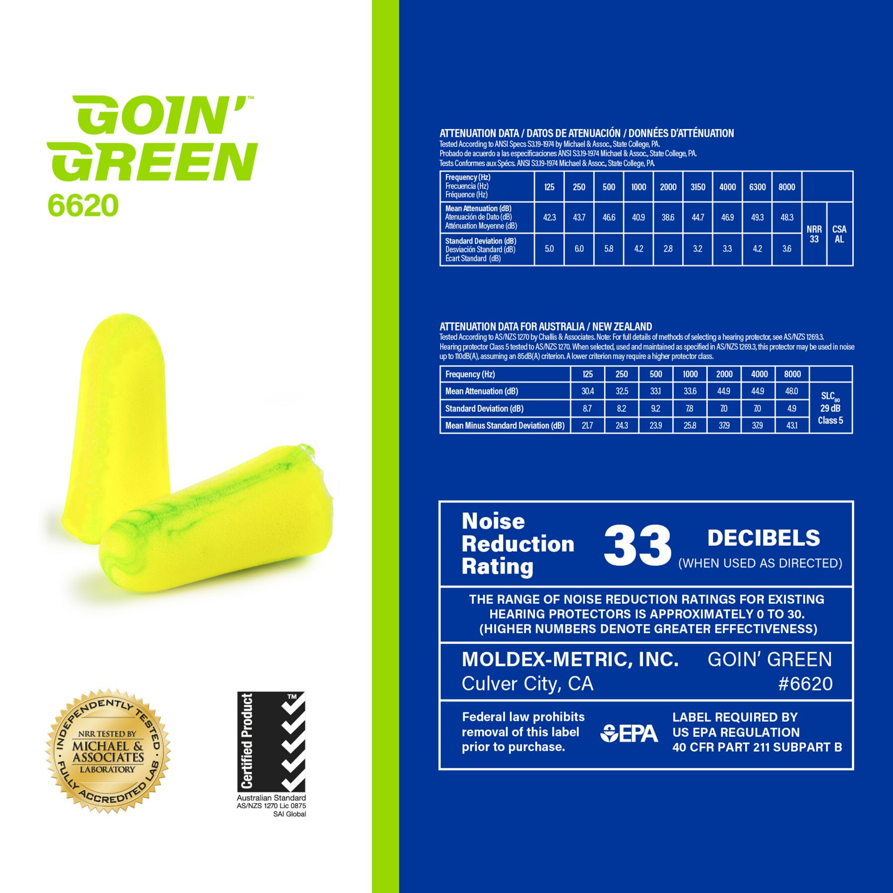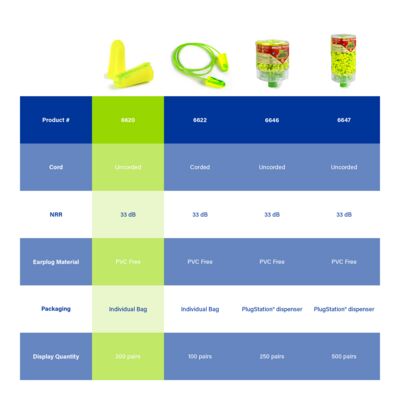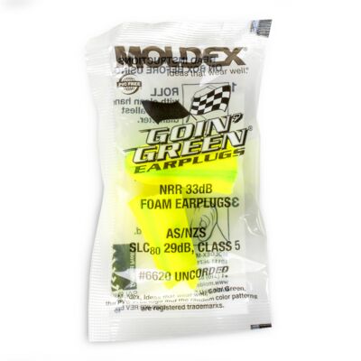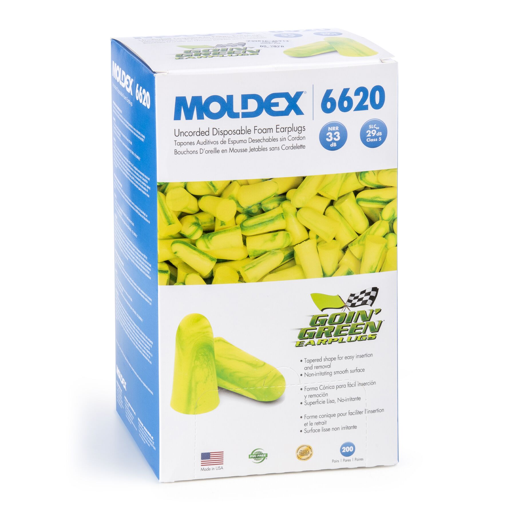 Goin' Green® Uncorded Foam Earplugs, 200 pairs per box Look for the exclusive colored streaks and swirls as a symbol of Moldex quality. They are made of extra-soft, extra light foam. Their tapered shape fits easily in the ear canal, allowing them to seal gently and snugly. Plus, the outer surface of the earplug is smooth, so it doesn’t irritate the ear canal. They’re so comfortable you’ll forget you’re wearing earplugs. Highest Independently tested NRR 33 dB Made in America