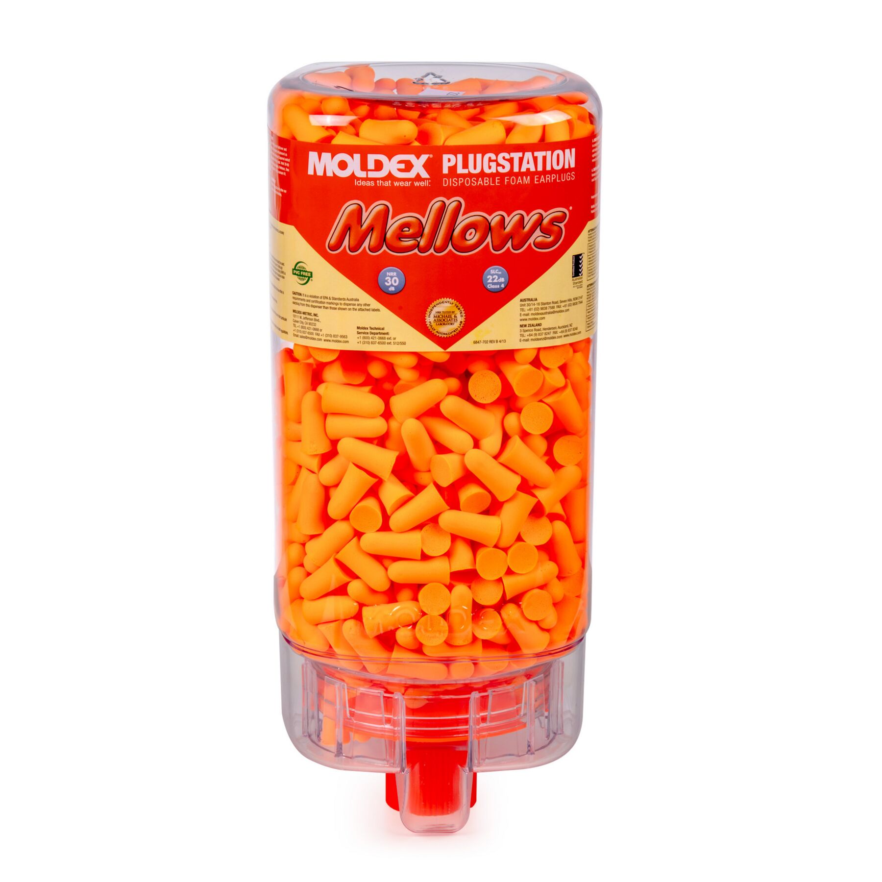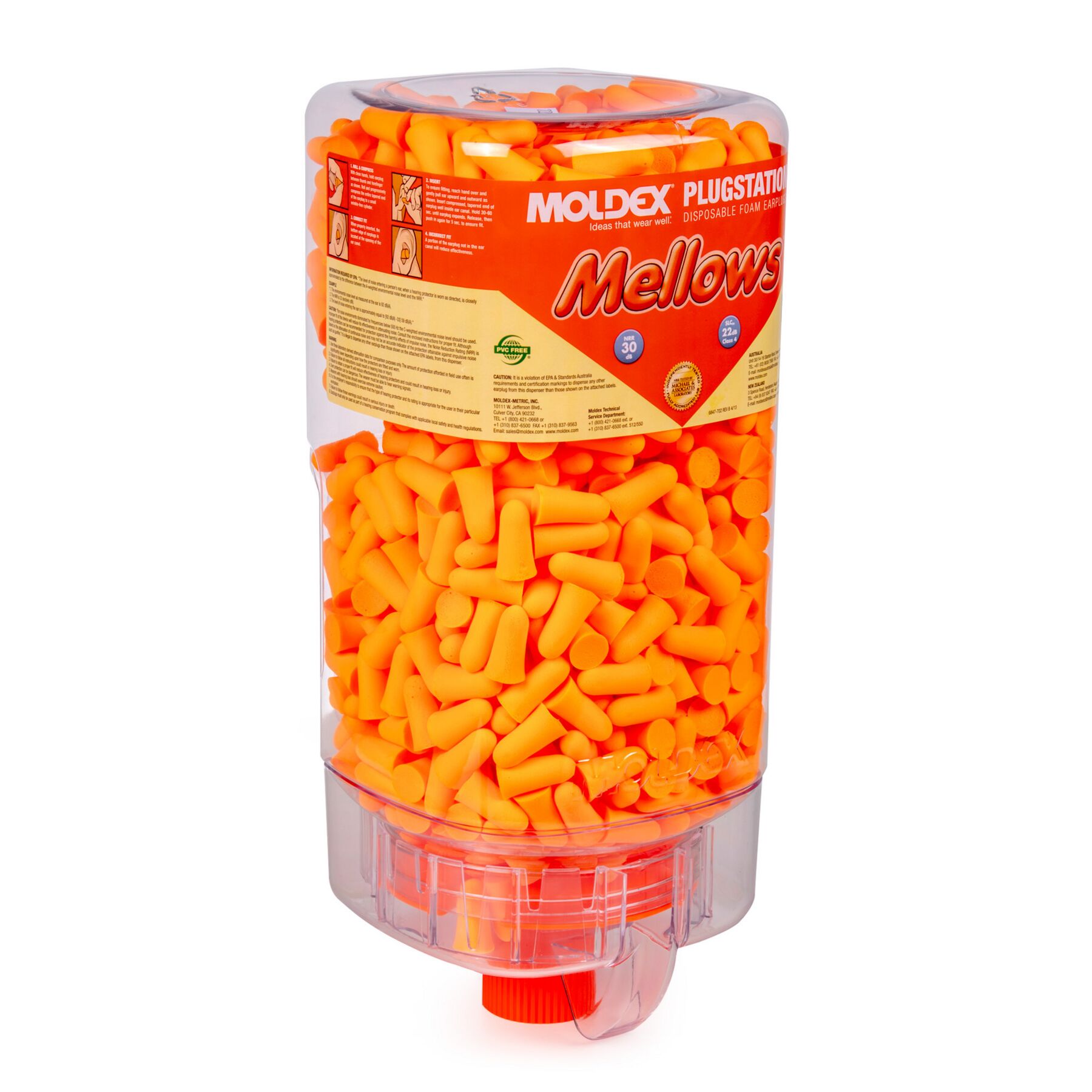 Mellows® PlugStation® 500 pairs per dispenser The most popular earplug dispenser on the market. Sealed container to ensure plugs remain clean and sanitary. No catch trays to reduce the spread of contamination. When Plugstation is empty, simply dispose of it and hang a new one. Anywhere and Everywhere Hygenic, cost-efficient, PVC-free and easy to hang/remove. INCREASED COST SAVINGS Workers take one pair at a time there is no wasteful grabbing of multiple pairs or pocket fill-ups that end up getting trashed without being used. Less waste means more cost savings. Mellows® are Extra-soft, low-pressure foam for comfort and fit Tapered shape for easy insertion and removal Non-irritating smooth surface High visibility color makes compliance checks quick and easy Shaped to fit even very small ear canals Independently tested, NRR 30 dB Made in America