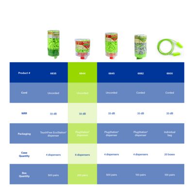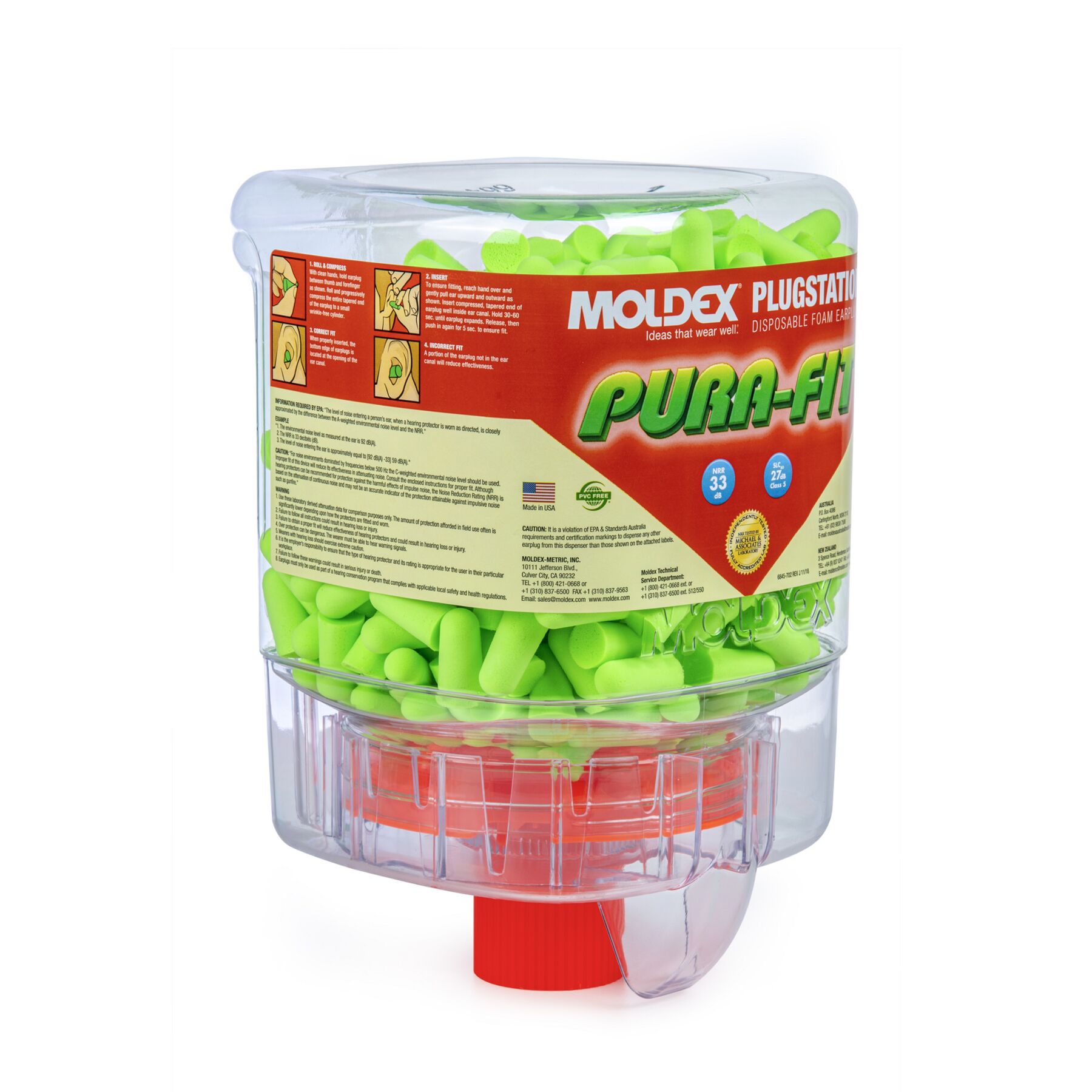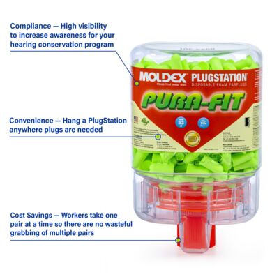 Pura-Fit® Plugstation, 250 pairs per dispenser. Hang Dispenser anywhere and everywhere. Design to reduce waste and cost. HIGHEST INDEPENDENTLY TESTED NRR 33 EARPLUGS Pura-Fit earplugs offer the highest independently tested NRR 33, making them suitable for most noisy environments. So, while they look like fun, they provide serious protection. Recycable. Made in America.