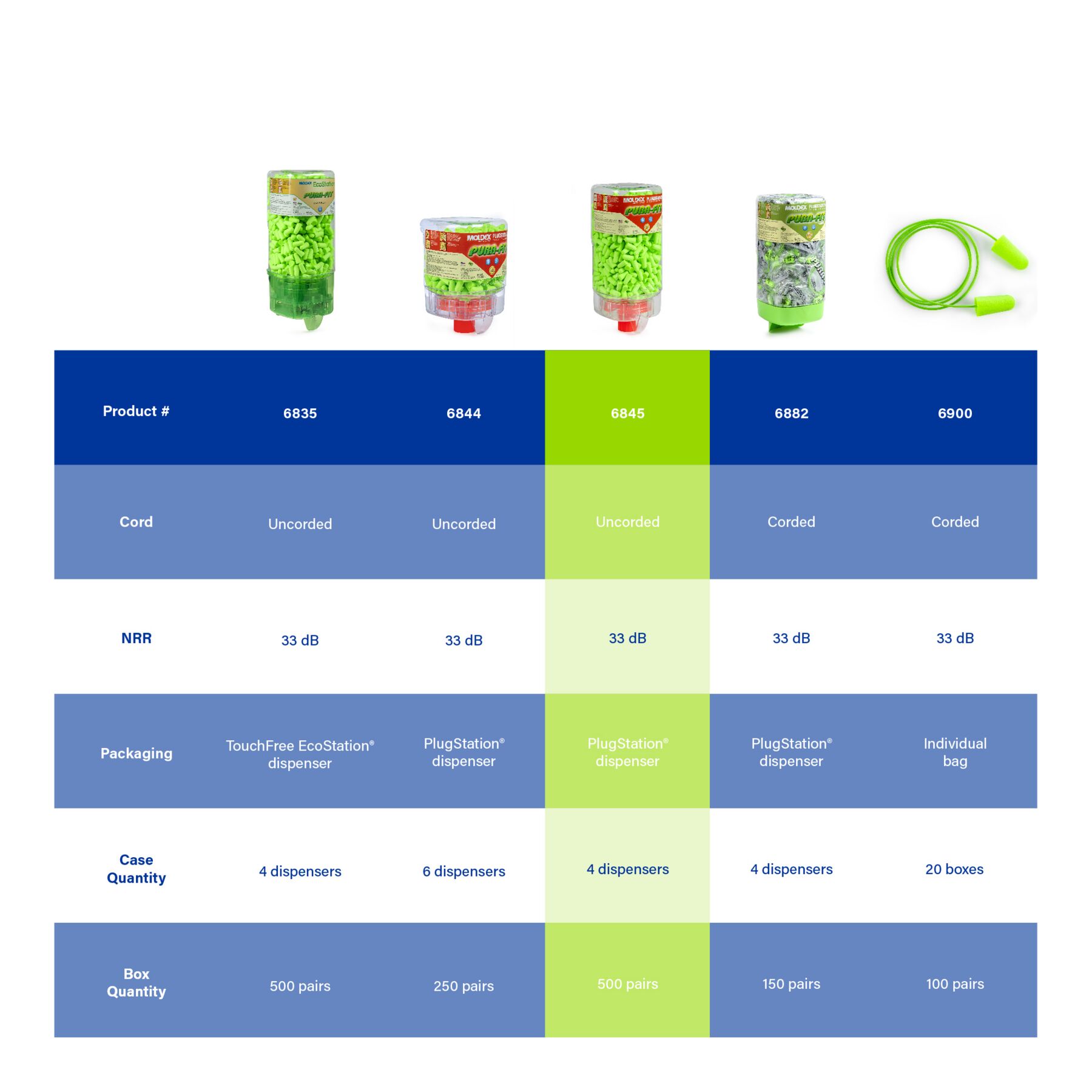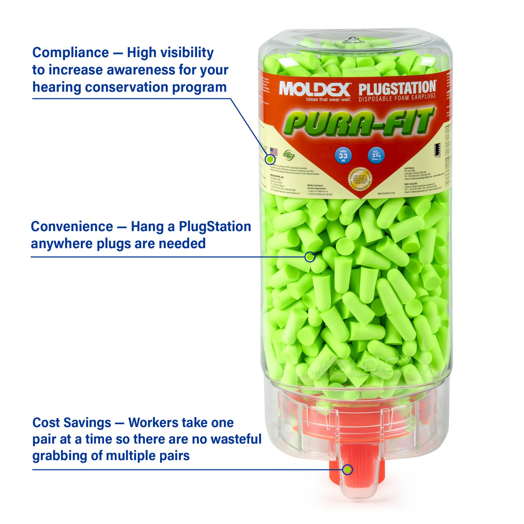 Pura-Fit® Plugstation, 500 pairs per dispenser. Hang Dispenser anywhere and everywhere. Design to reduce waste and cost. HIGHEST INDEPENDENTLY TESTED NRR 33 EARPLUGS Pura-Fit earplugs offer the highest independently tested NRR 33, making them suitable for most noisy environments. So, while they look like fun, they provide serious protection. Recycable. Made in America.