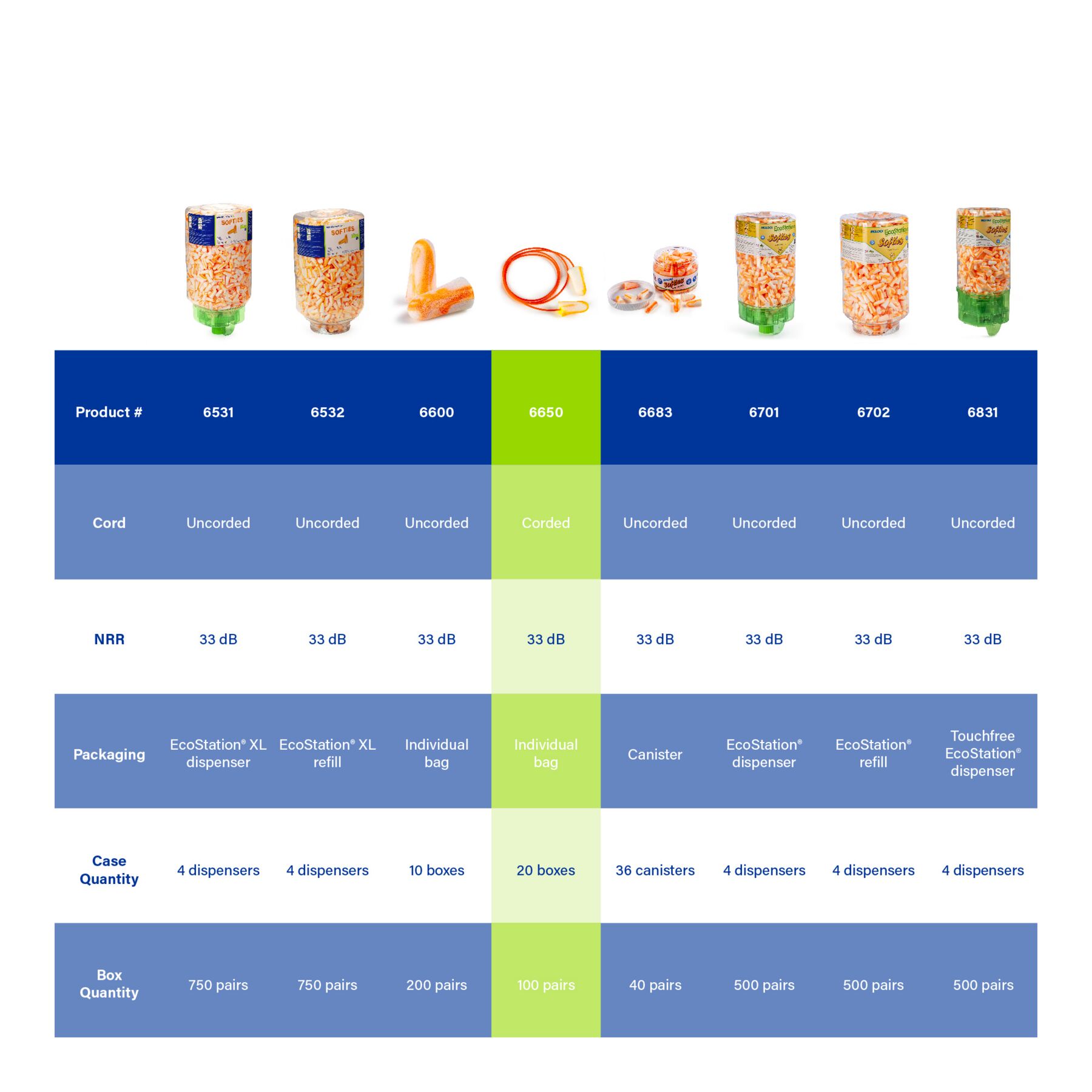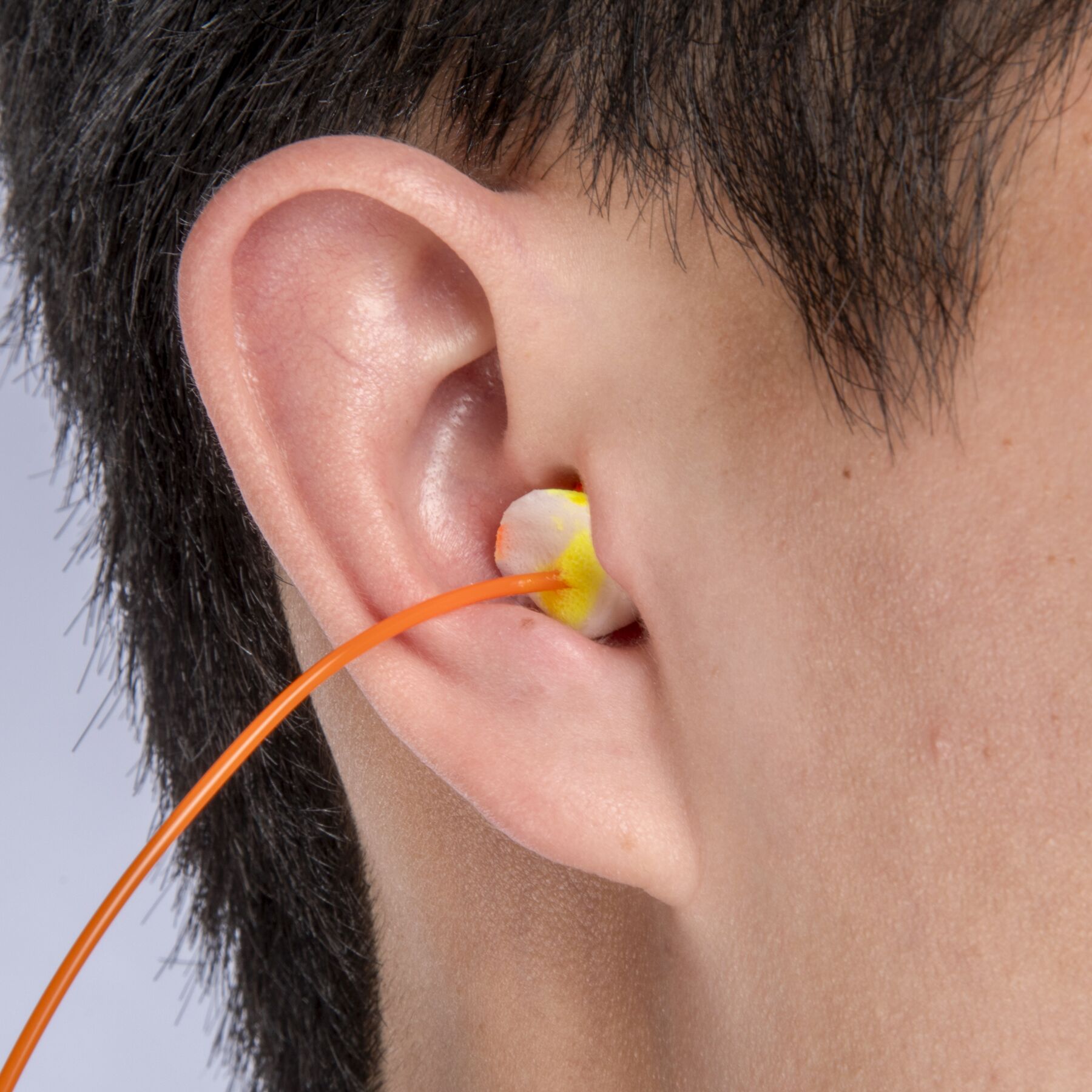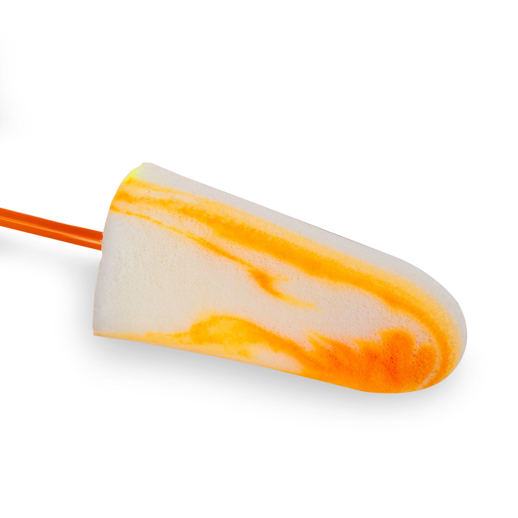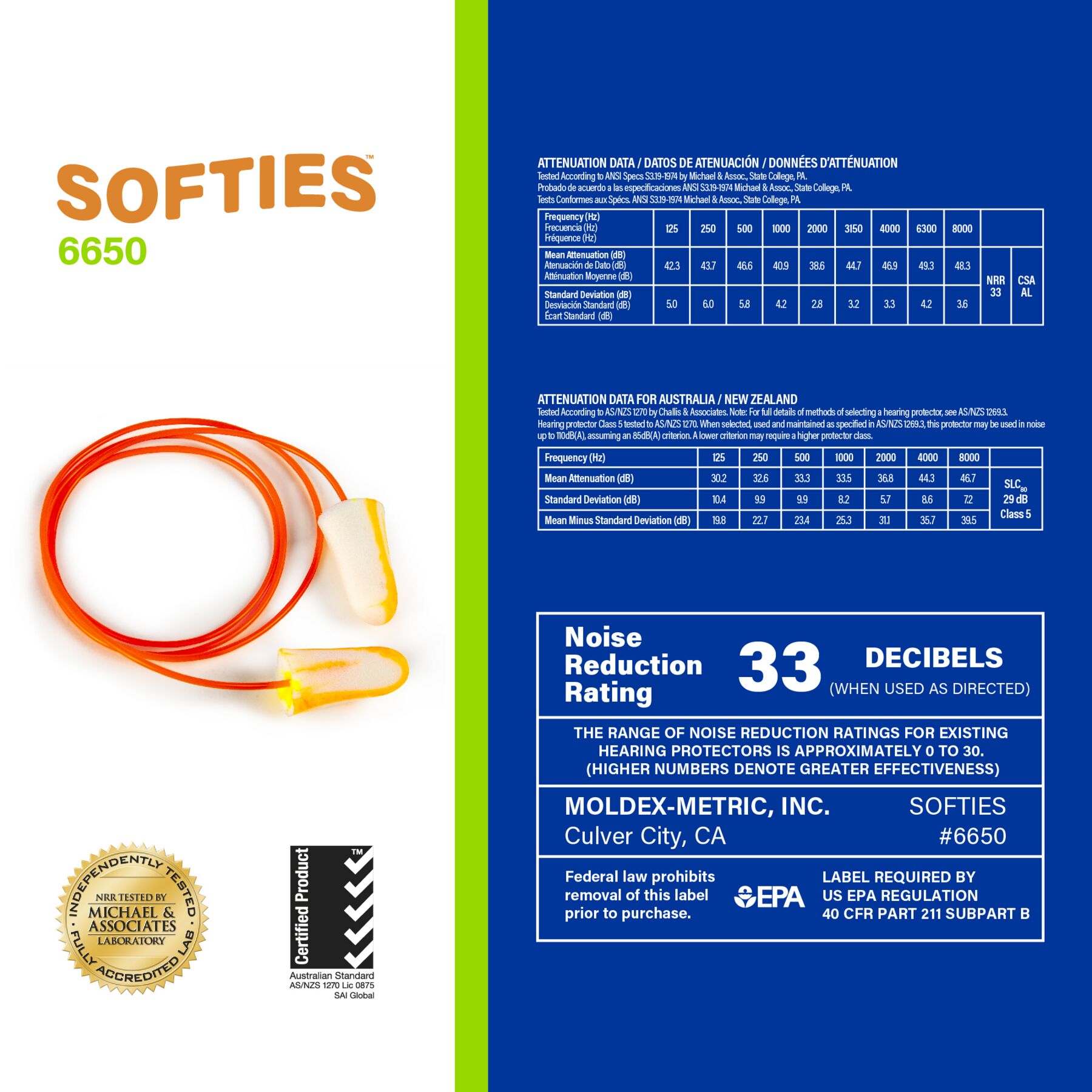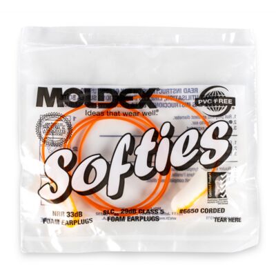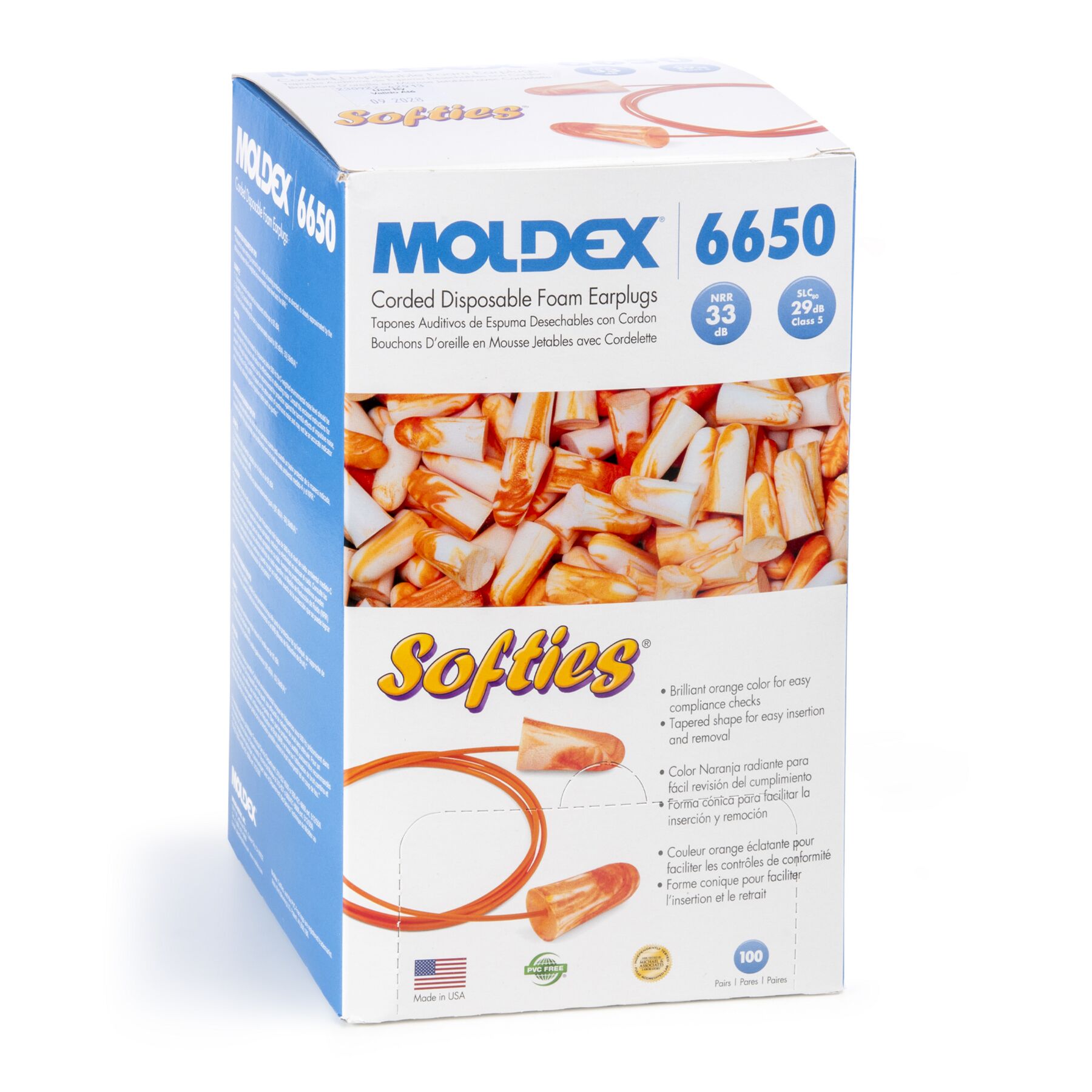 Meet Moldex Softies® 6650 Corded disposable foam earplugs, delivering the highest independently tested NRR at 33 dB. Made from extra-soft, low-pressure foam, they provide a secure fit that stays comfortable through long shifts. Their tapered shape fits easily in the ear canal, and seals gently and snugly, while a smooth, non-irritating surface ensures all-day wearability. Look for the exclusive-orange Softies® streaks and swirls — a bold symbol of Moldex quality and trusted protection. Also available in uncorded 6600. All Moldex disposable earplugs are 100% Made in America.