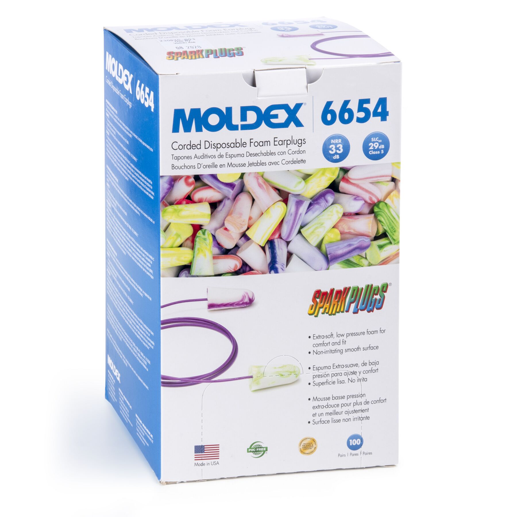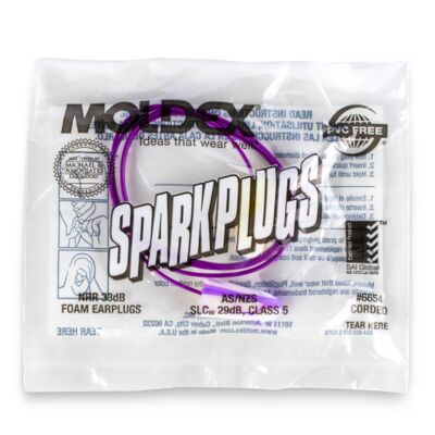 Meet Moldex SparkPlugs® 6654 Corded disposable foam earplugs, delivering the highest independently tested NRR at 33 dB. Made from extra-soft, low-pressure foam, they provide a secure fit that stays comfortable through long shifts. Their tapered shape fits easily in the ear canal, and seals gently and snugly, while a smooth, non-irritating surface ensures all-day wearability. Look for the exclusive-colored SparkPlugs® streaks and swirls—a bold symbol of Moldex quality and trusted protection. Also available in uncorded 6604 and metal detectable 6615. All Moldex disposable earplugs are 100% Made in America.