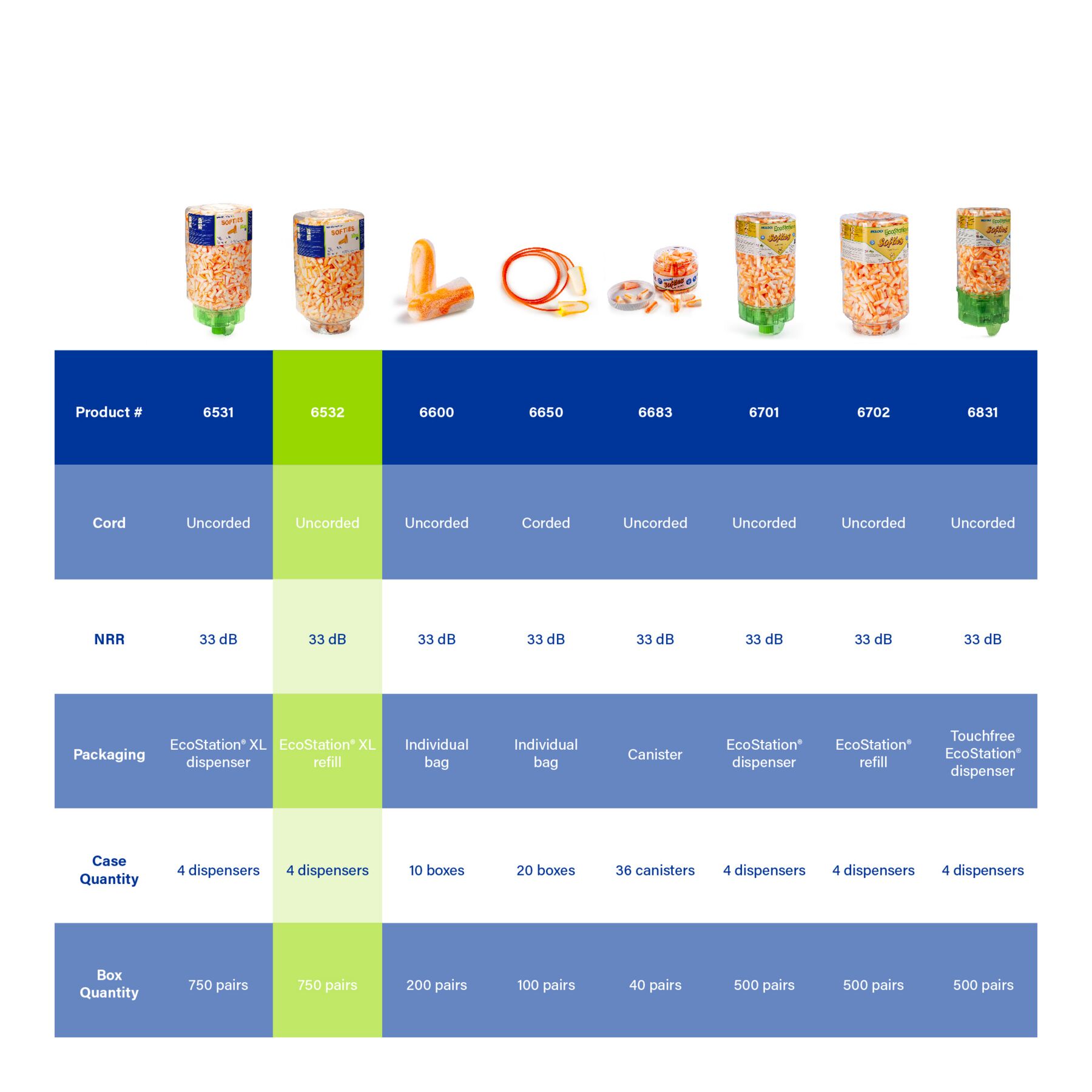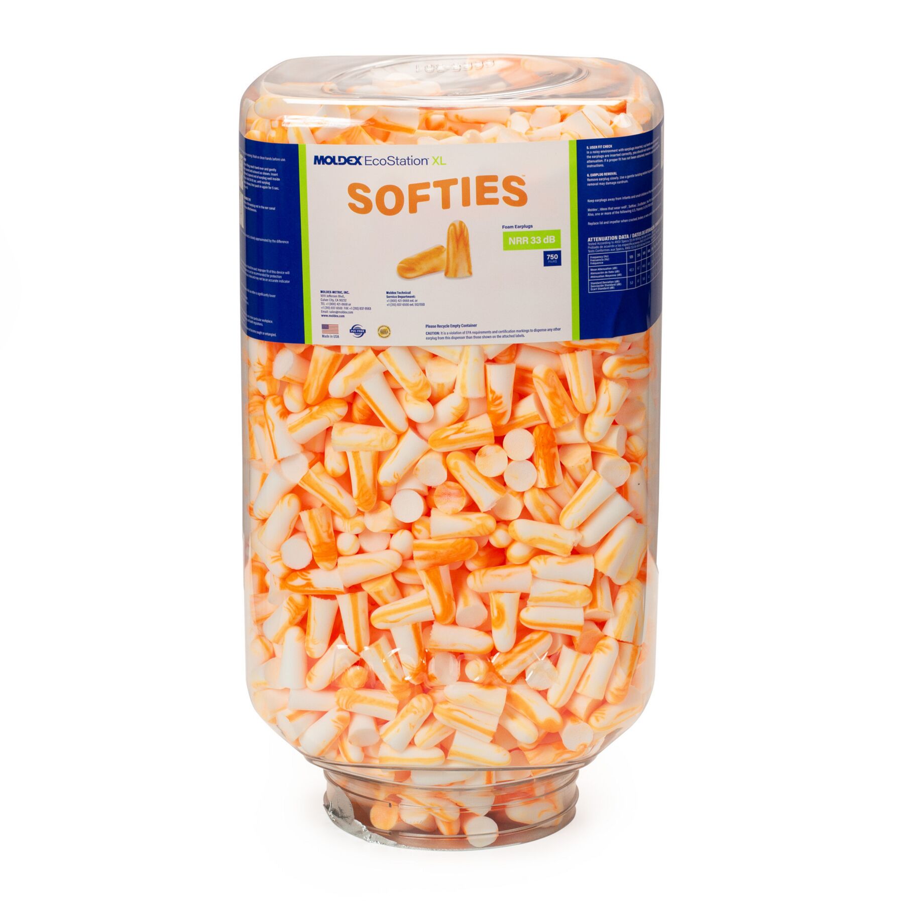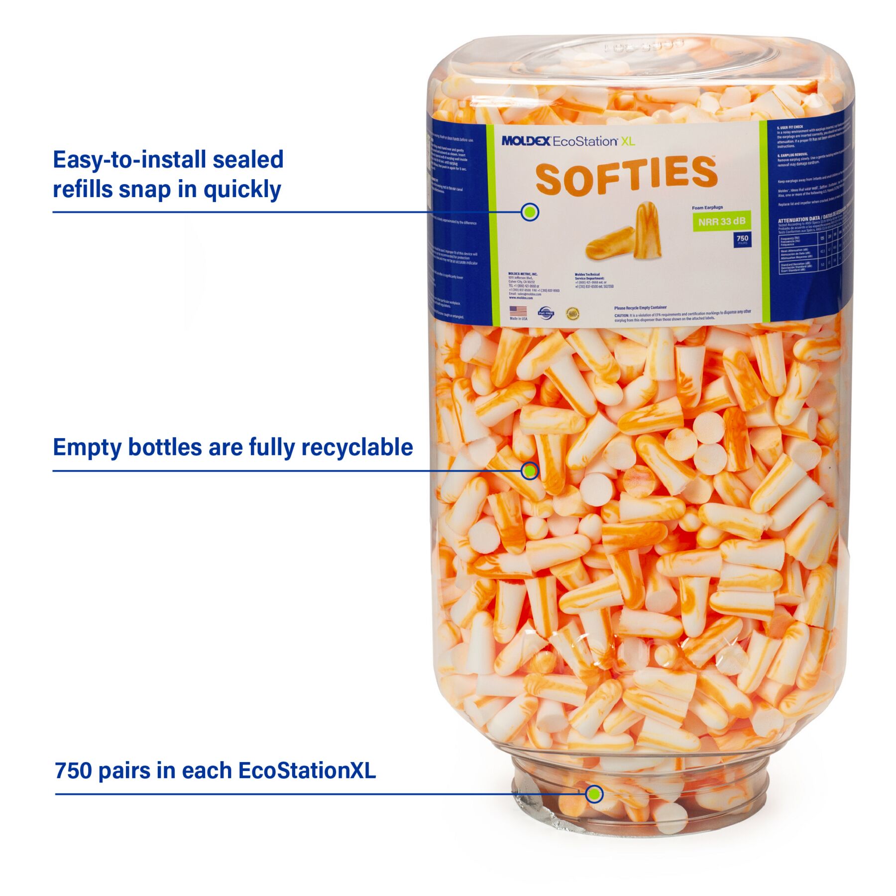 Softies® EcoStation REFILL, 750 pairs per dispenser More cost-effective and hygienic than other earplug dispensers. SNAP-IN REFILLS are available for the fastest and easiest changeover. 100% recyclable dispenser. Softies® are made of extra-soft, extra-light foam. Their tapered shape fits easily in the ear canal. Softies® seal snugly without uncomfortable pressure. Their outer surface is smooth, so it doesn’t irritate the ear canal. HIGHEST INDEPENDENTLY TESTED NRR 33 EARPLUGS Made in America.