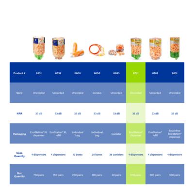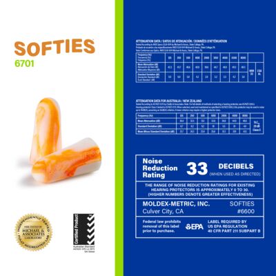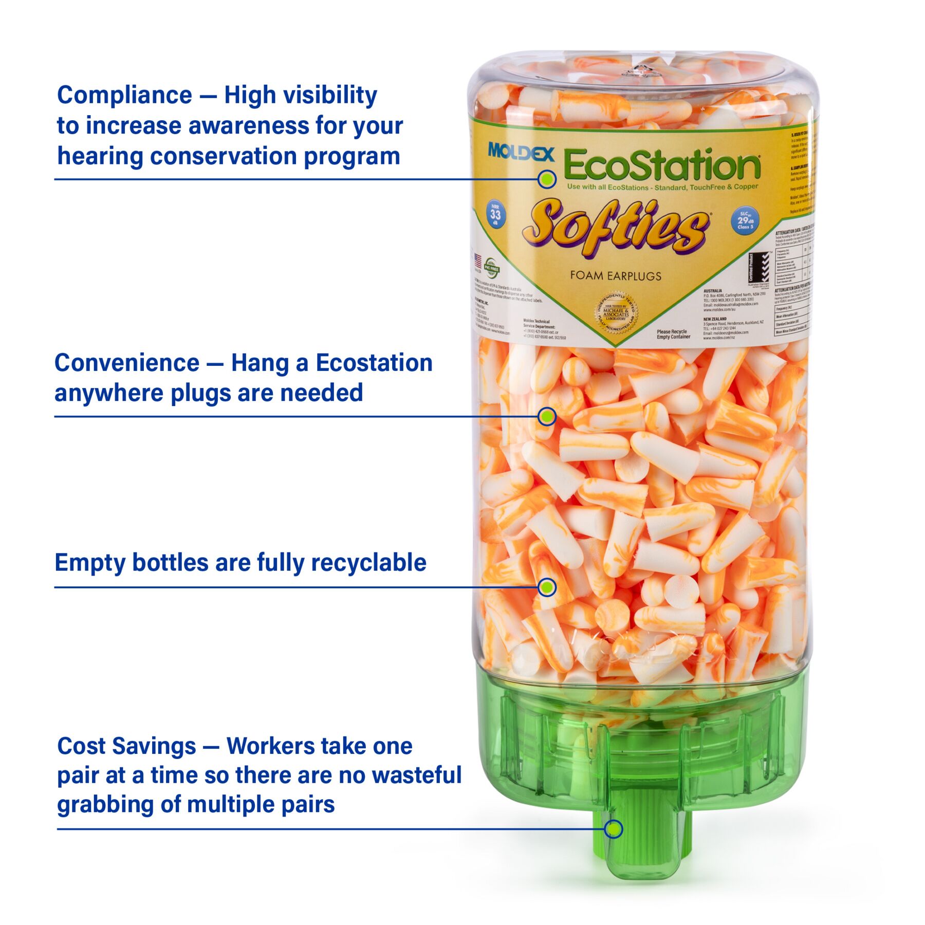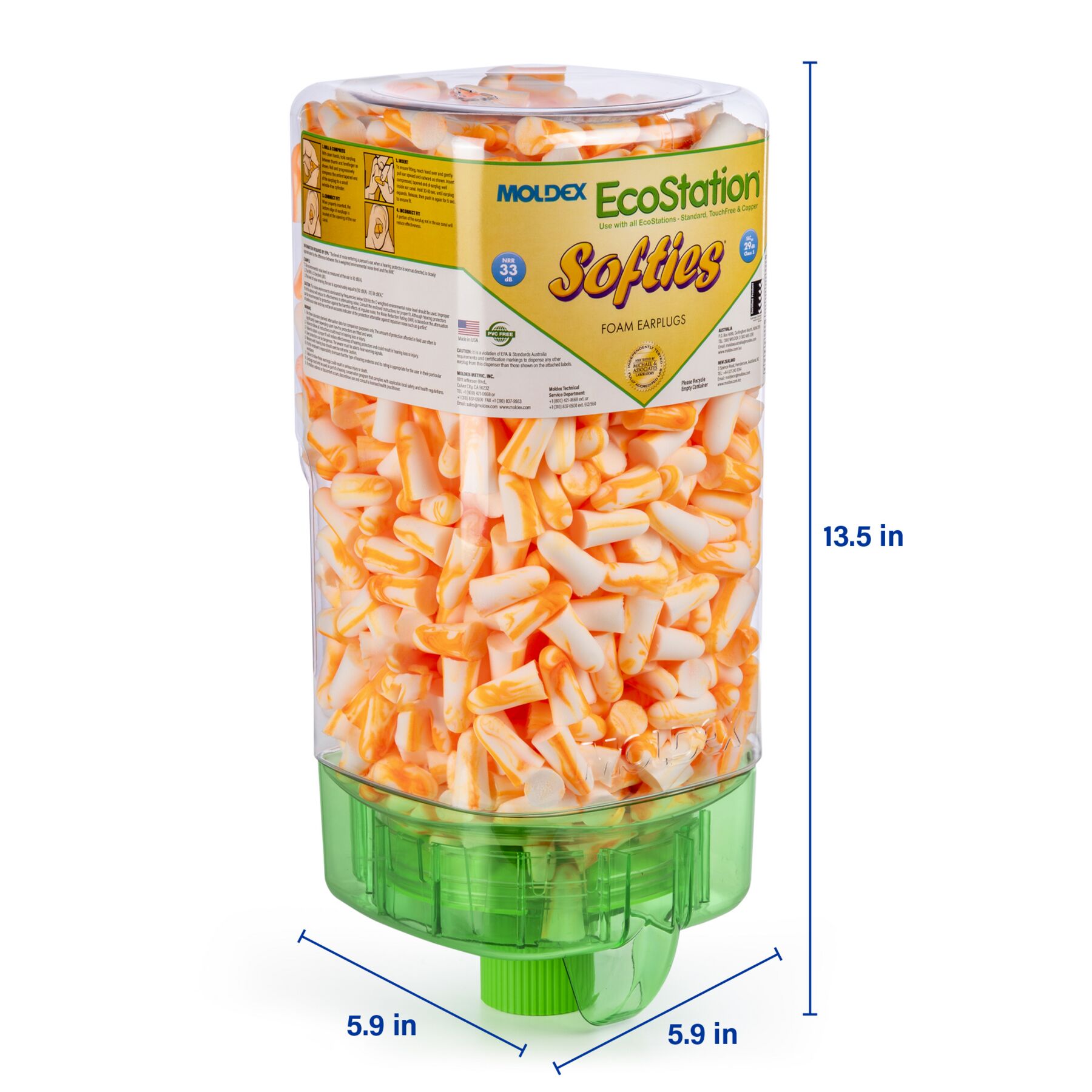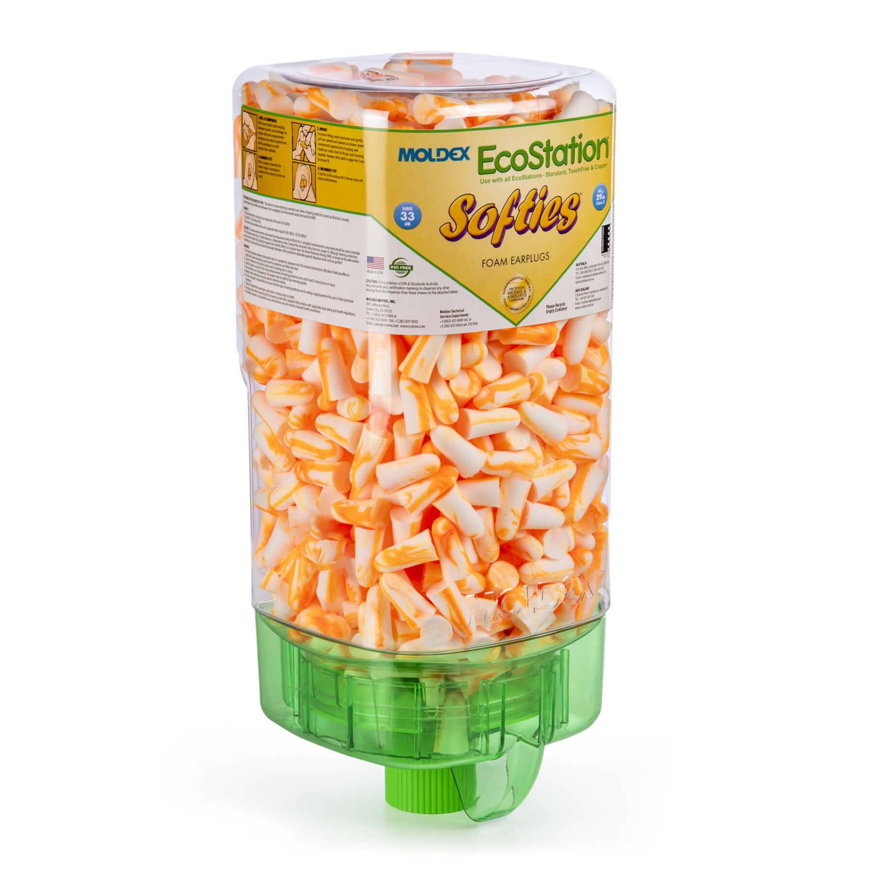Softies® EcoStation Starter Kit comes with one 500 pairs assembled dispenser and hanging bracket More cost-effective and hygienic than other earplug dispensers. SNAP-IN REFILLS are available for the fastest and easiest changeover. 100% recyclable dispenser. Softies® are made of extra-soft, extra-light foam. Their tapered shape fits easily in the ear canal. Softies® seal snugly without uncomfortable pressure. Their outer surface is smooth, so it doesn’t irritate the ear canal. HIGHEST INDEPENDENTLY TESTED NRR 33 EARPLUGS Made in America.