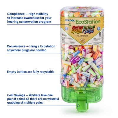 Meet Moldex SparkPlugs® EcoStation® 6703. Each EcoStation® holds 500 pairs of earplugs and gives workers easy access to hearing protection wherever it’s needed. High visibility supports compliance by raising awareness for your hearing conservation program. Easily pair with our 6868 and 6869 convenient magnetic brackets for easy, hassle-free wall mounting solutions. Cost savings come built in, as workers take one pair of ear plugs at a time—no more wasteful grabbing of multiple pairs. Easy-to-install sealed refills snap in quickly. Made in America.