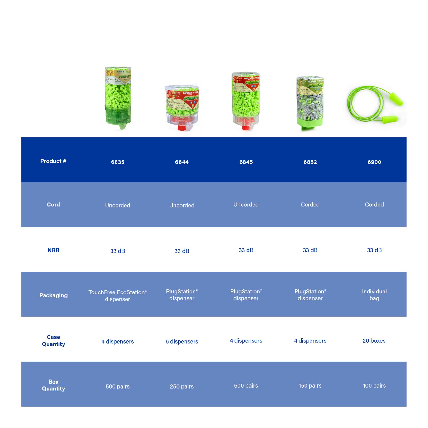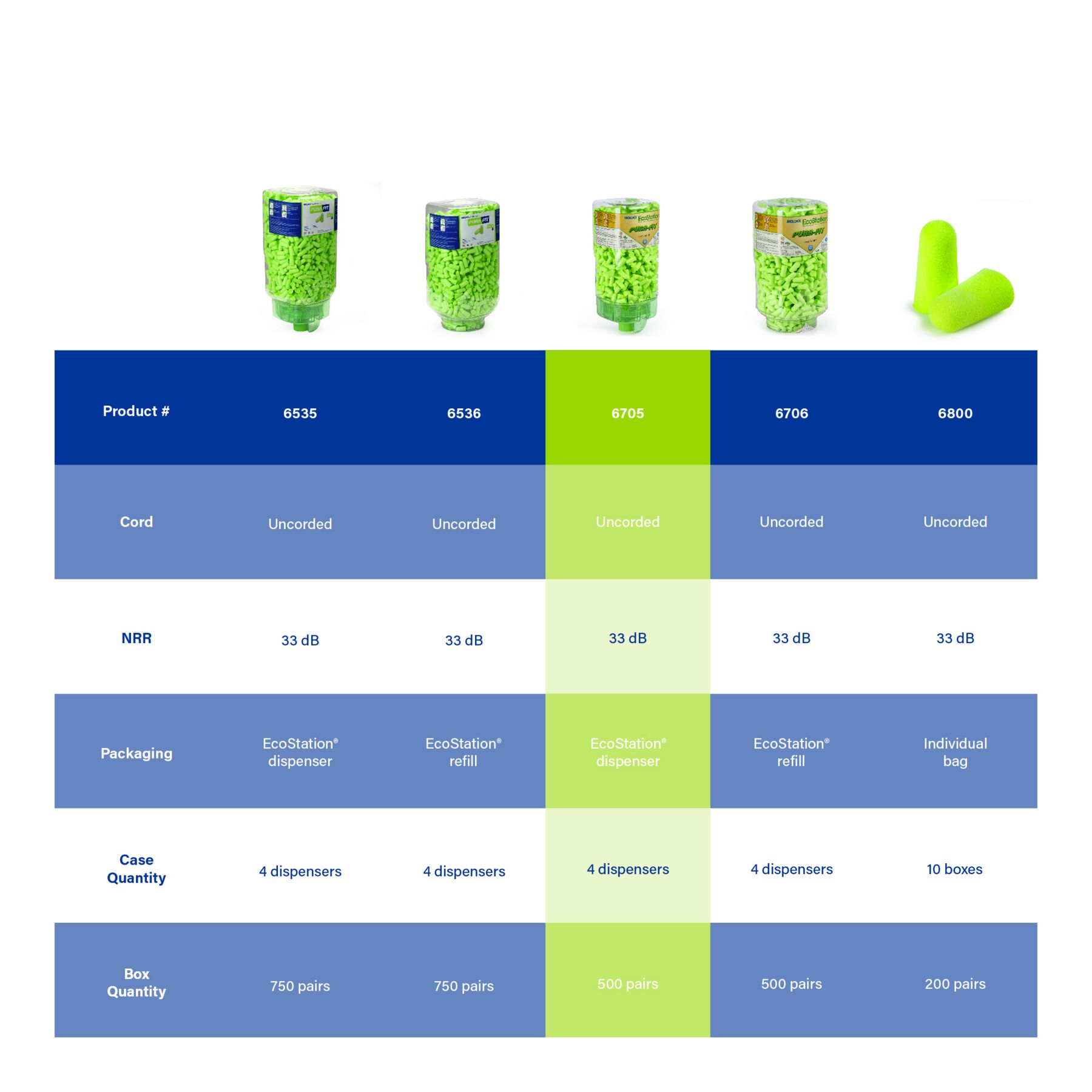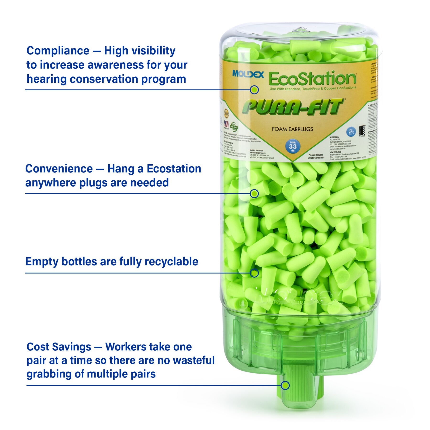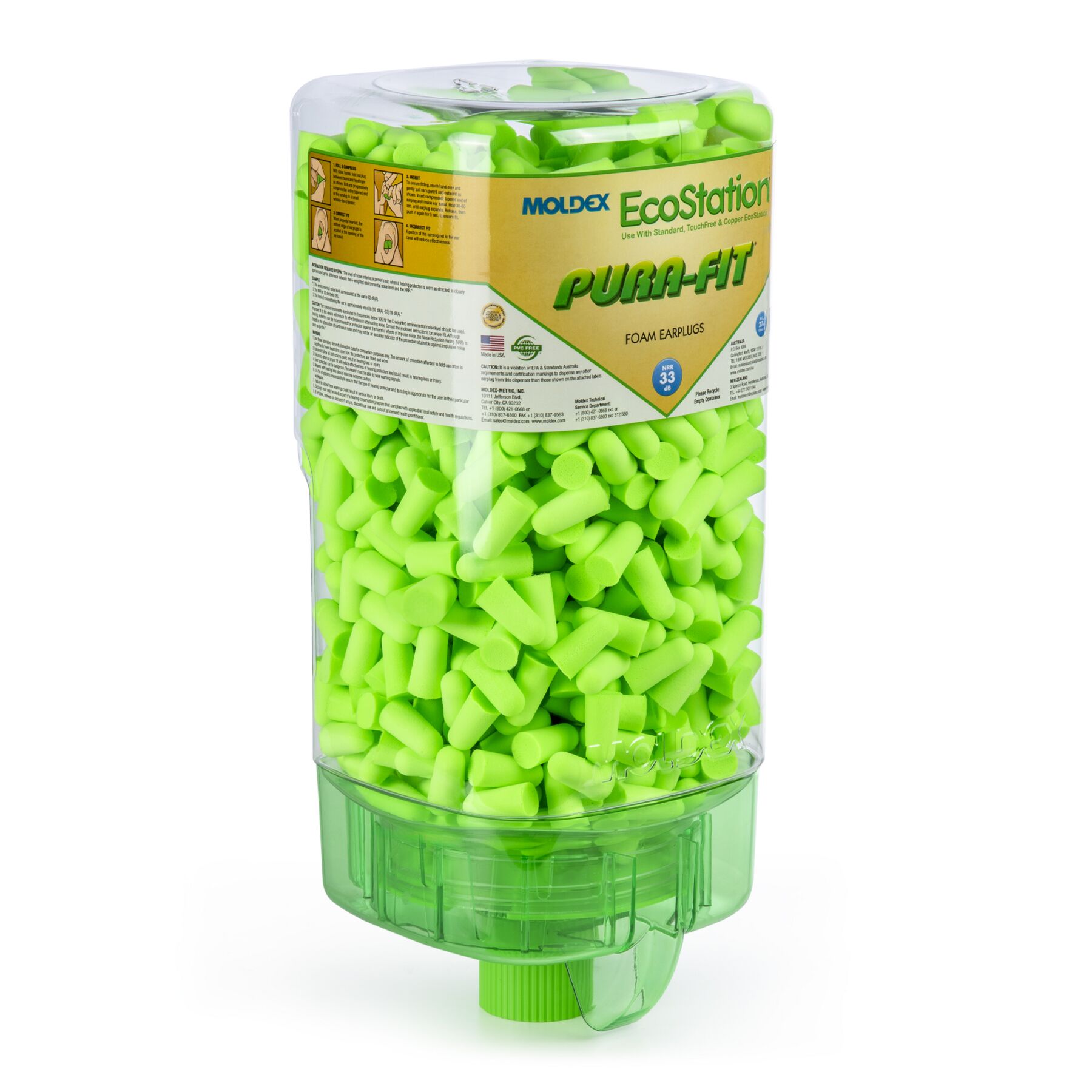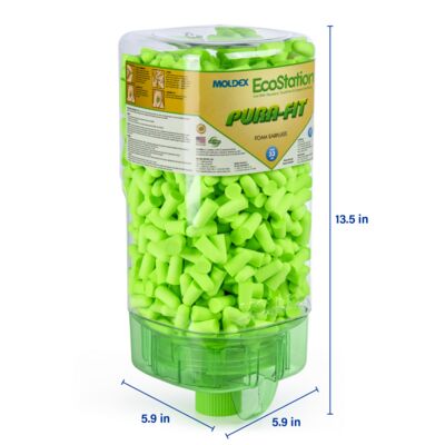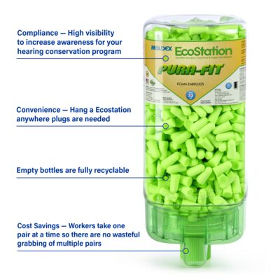 Meet Moldex Pura-Fit® EcoStation® 6705. With 500 pairs of Pura-Fit® Uncorded Foam Earplugs, our high-capacity hearing protection solution is designed to make safety more accessible and cost-effective throughout your facility. The included Pura-Fit® disposable foam earplugs feature an independently tested NRR of 33 dB. EcoStation® helps reduce program costs with easy SNAP-IN refills for fast, clean, hygienic changeovers. Use the included bracket or optional 6868 or 6869 magnetic brackets (sold separately) to hang wherever earplugs are needed. When empty, simply recycle the dispenser and replace it with a refill. 100% Made in America.