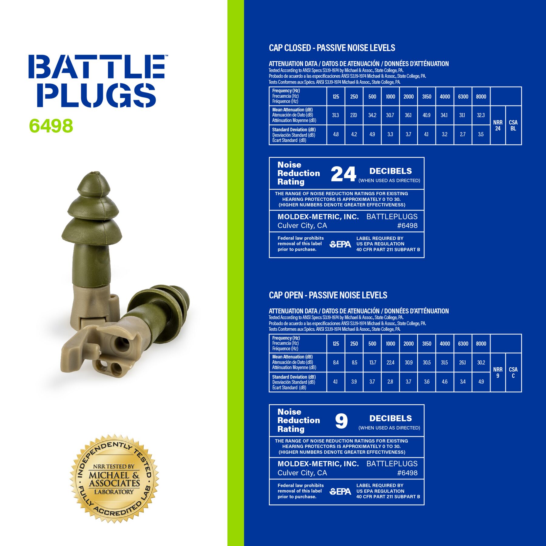Meet Moldex® BattlePlugs® Impulse Reusable Earplug, 6498, Medium, Dual Mode Protection. Patented Moldex BattlePlugs earplugs use a unique filter built into the plug body to instantaneously reduce dangerous, sudden impulse noises (e.g. weapons fire) plus allow for easy communication and improved awareness in the cap open position NRR 9dB. Closed cap for continuous / steady noise and impulse noise protection: NRR 24dB. Cap is easy to open and close while in ear, and easy to see when cap is in open or closed mode. Both earplug tips and body are easy to clean. Please follow instruction manual for proper use and care. Independently tested. Durable and reusable for extended service life, BattlePlugs® are built for environments where protection and readiness must work together. Made in America.