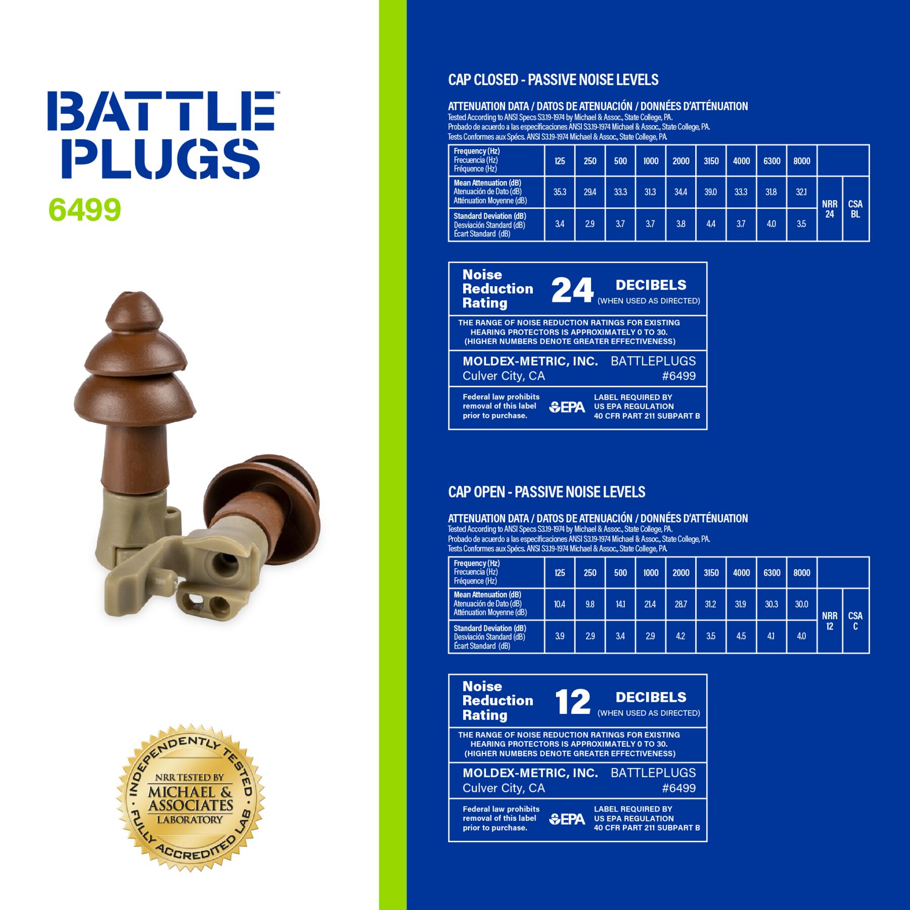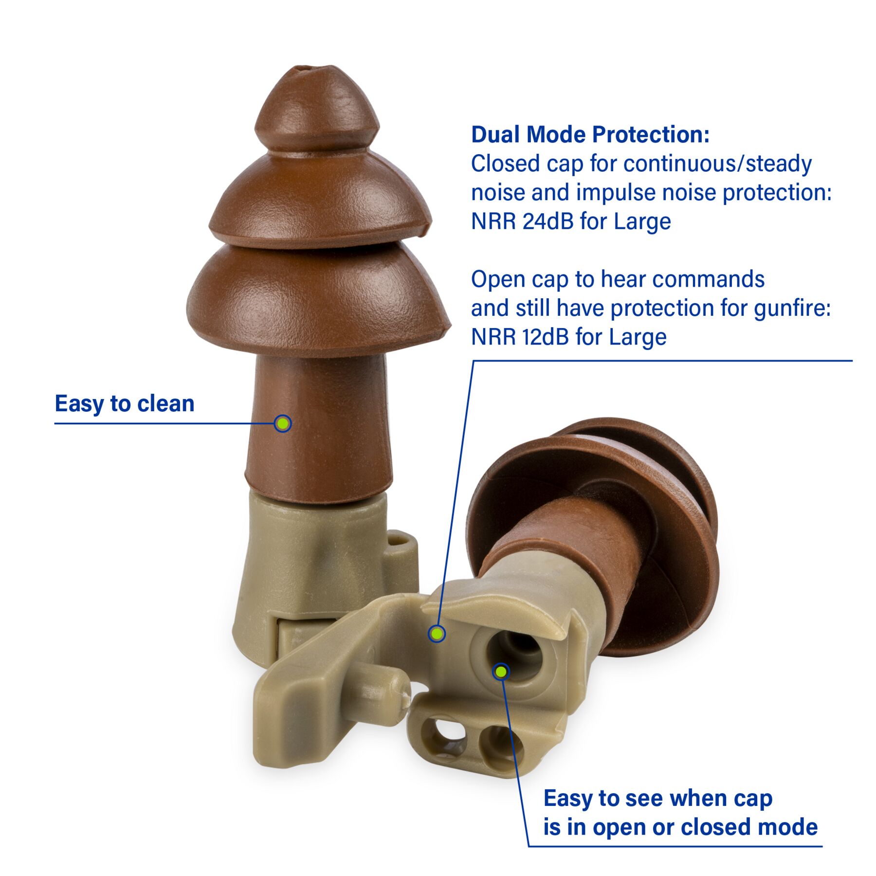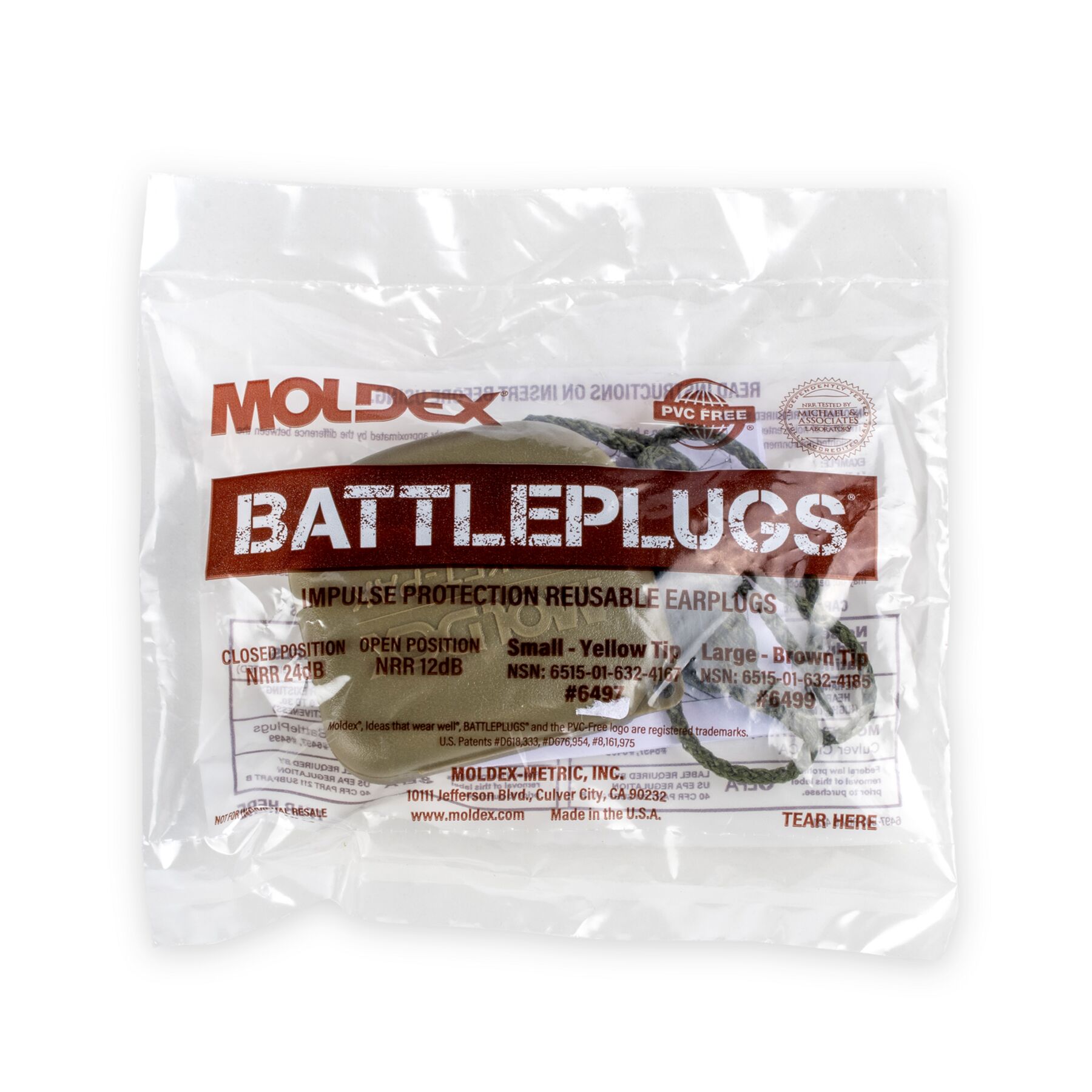 Meet Moldex® BattlePlugs® Impulse Reusable Earplug, 6499, Large, Dual Mode Protection. Patented Moldex BattlePlugs earplugs use a unique filter built into the plug body to instantaneously reduce dangerous, sudden impulse noises (e.g. weapons fire) plus allow for easy communication and improved awareness in the cap open position NRR 12dB. Closed cap for continuous / steady noise and impulse noise protection: NRR 24dB. Cap is easy to open and close while in ear, and easy to see when cap is in open or closed mode. Both earplug tips and body are easy to clean. Please follow instruction manual for proper use and care. Independently tested. Durable and reusable for extended service life, BattlePlugs® are built for environments where protection and readiness must work together. Made in America.