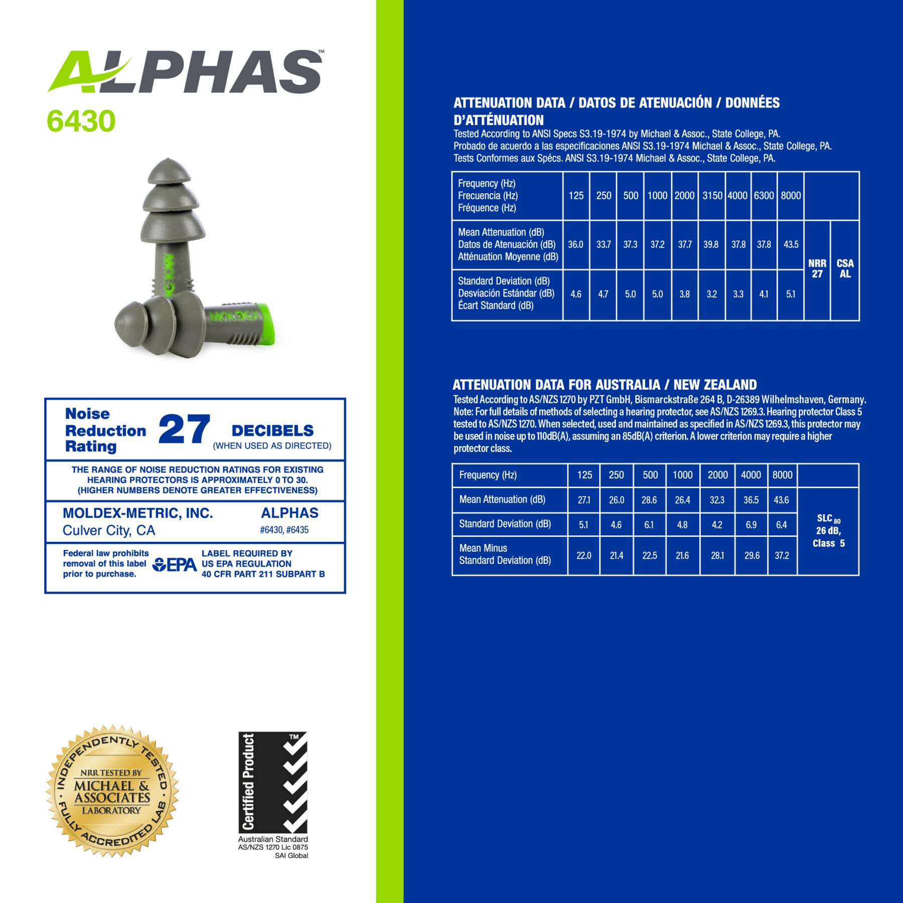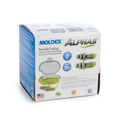 Meet Moldex® Alphas™ Reusable Earplugs 6430, dependable hearing protection designed for repeated use in demanding work environments. Alphas™ earplugs feature a flanged design with a ridged stem that offers a comfortable fit and supports easy insertion and removal — even when gloves are worn. Independently tested to an NRR of 27 dB, the flexible flanges help provide effective noise reduction for everyday industrial use. Washable and supplied with a Pocket-Pak® Plus storage case, Alphas™ give workers the protection they need and the comfort they deserve, while helping lower overall hearing protection program costs. Made in the USA.