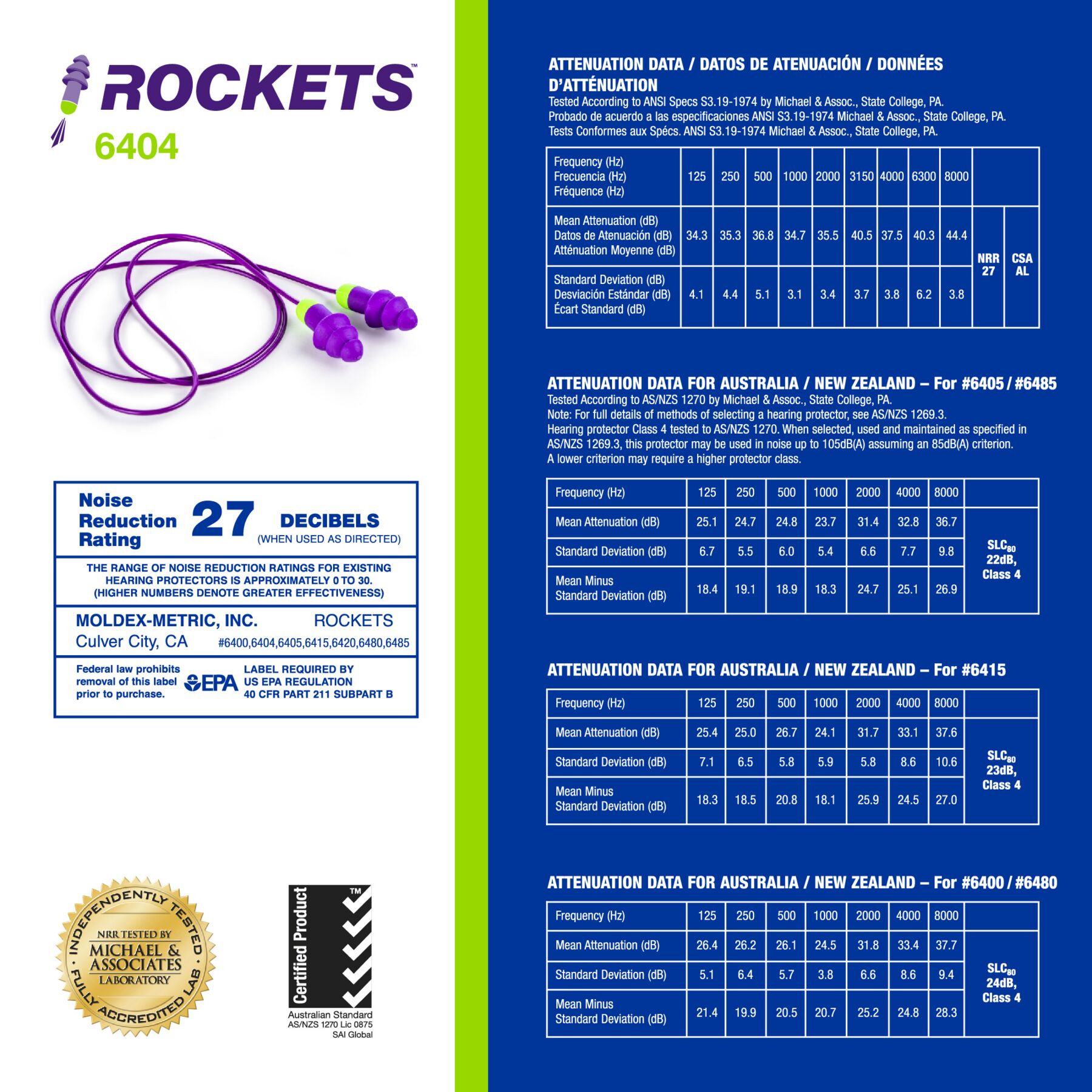 Moldex Rockets® Corded Reusable Earplug 6404, NRR 27dB