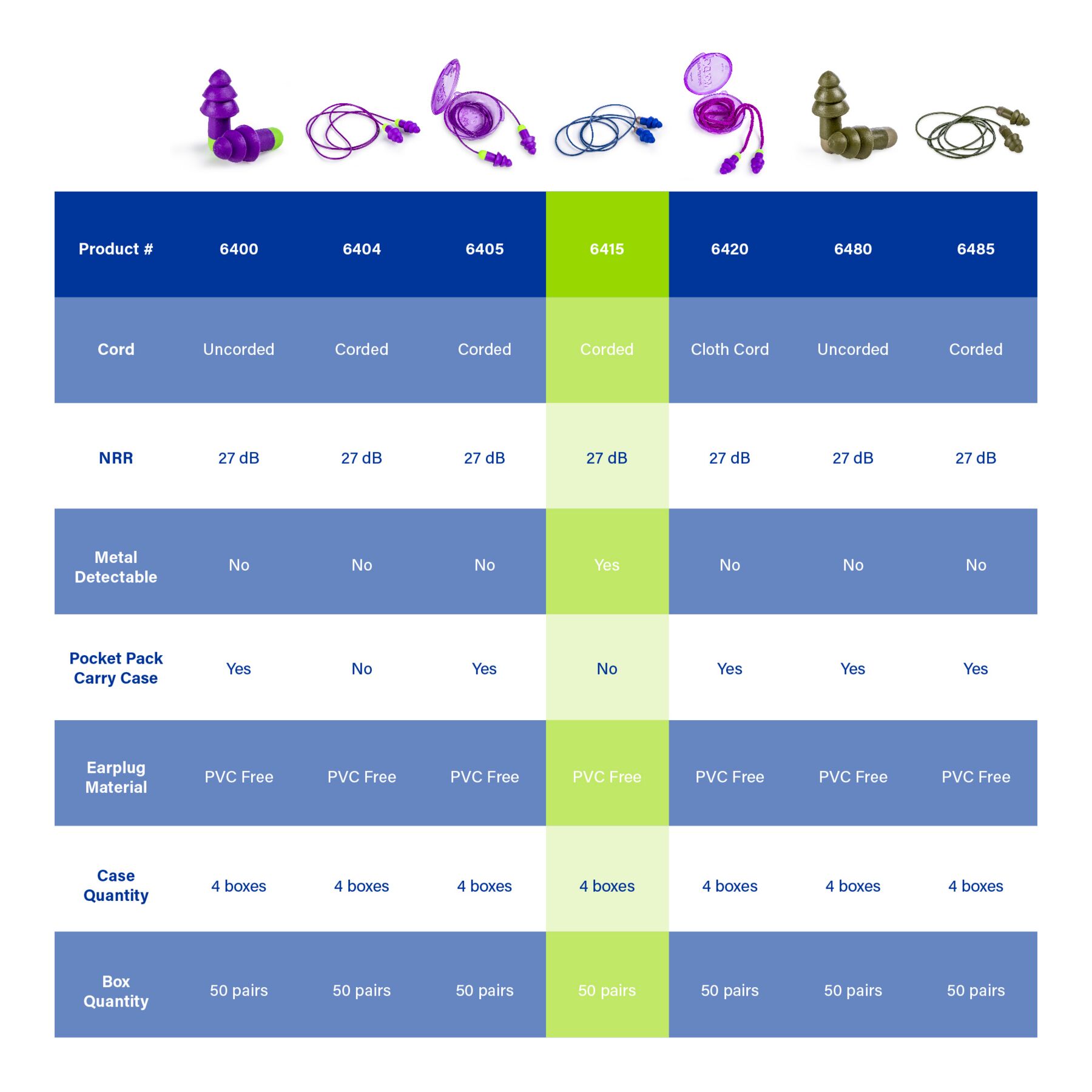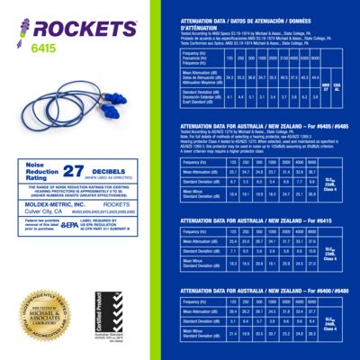 Meet Moldex® Rockets® Metal Detectable Reusable Earplugs 6415, durable hearing protection designed for repeated use in demanding work environments. The soft, flexible flanges provide a superior seal and fit most size ear canals, while the air bubble in the tip provides cushioned comfort for all-day wear. Both earplugs and cord are independently metal detectable for added safety. The enclosed metal spring eliminates any exposed metal, and the earplugs are corded to prevent earplug loss. The bright blue color is perfect for food processing applications. Independently tested to an NRR of 27 dB, the flexible polymer flanges deliver effective noise reduction while supporting consistent wear and long-term comfort. Washable and built for extended service life, Rockets® metal detectable reusable earplugs are well suited for food processing, pharmaceutical, and other controlled environments. Made in the USA.