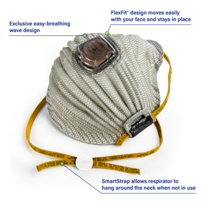 Meet AirWave® 4700N100 Series— Made in America. Built for easy breathing, lasting comfort, and dependable performance. The exclusive wave design lets in more air, while the 4701N100's Ventex® Valve releases hot air quickly to keep breathing cool. FlexFit® moves with your face and stays in place for all-day comfort. The tough Dura-Mesh® shell resists collapse in heat or humidity. The results? A respirator that lasts longer and feels more comfortable to the worker, boosting compliance and morale, while reducing usage and costs. AirWave. More Air. More Wear.