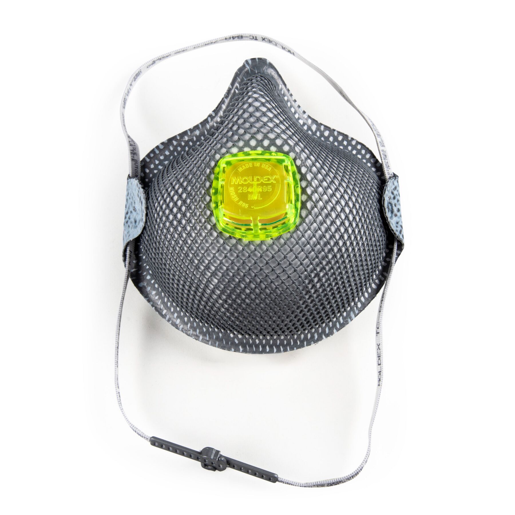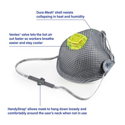 Meet Moldex® 2840 Series, Nuisance Organic Vapors, HandyStrap Respirator with Ventex Valve, Made in America. R95 protection, resistant to oil- and non-oil-based particulates alike. The HandyStrap® lets it hang around your neck when not in use. Our distinctive Dura-Mesh® shell resists collapse in hot, humid environments and helps the respirator keep its shape longer. Added carbon layer helps filter out nuisance organic vapor odors (less than OSHA PEL). The facepiece is naturally contoured without pressure points. The results? A respirator that’s strong, dependable, and comfortable for workers to wear throughout the shift.