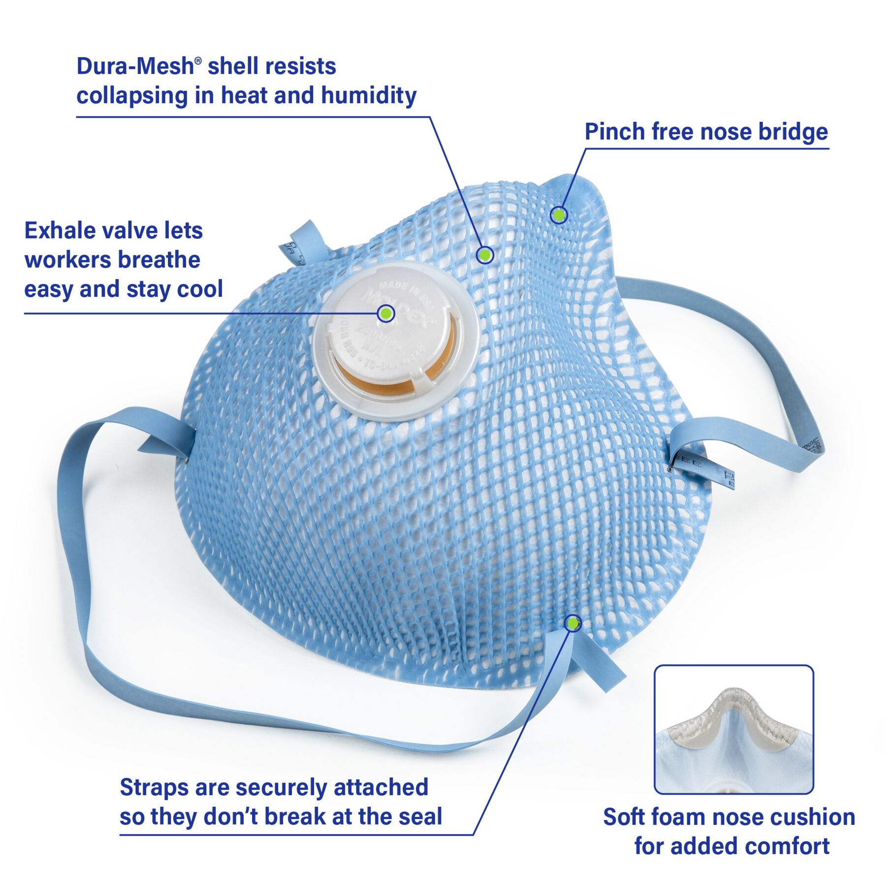 Meet Moldex® 2300N95 Series, 2-Strap Respirator with valve, Made in America. It’s designed with our distinctive Dura-Mesh shell, allowing the respirator to resist collapse in hot, humid environments and keep its shape longer. The facepiece is naturally contoured without pressure points, with a molded nose bridge and soft foam nose cushion that provides the wearer with an easy comfortable fit, without the need for metal noseband to adjust. Workers stay cooler with an exhale valve that reduces hot air build up. The results? A respirator that’s strong, dependable, and comfortable for workers to wear throughout the shift.