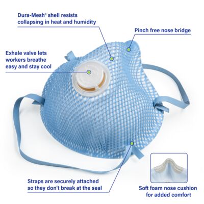 Meet Moldex® 2300V, 2-Strap Respirator with valve, Made in America. Our most popular respirators, now packaged for onsite vending machines. It’s designed with our distinctive Dura-Mesh shell, allowing the respirator to resist collapse in hot, humid environments and keep its shape longer. The facepiece is naturally contoured without pressure points, with a molded nose bridge and soft foam nose cushion that provides the wearer with a comfortable fit. Workers stay cooler with an exhale valve that reduces hot air build up. The results? A respirator that’s strong, dependable, and comfortable for workers to wear throughout the shift.