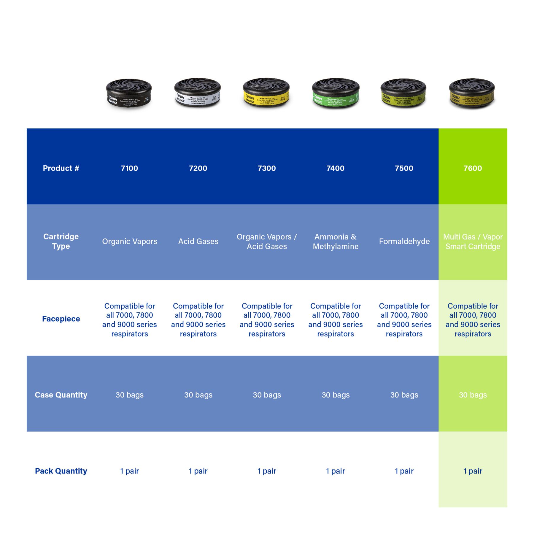 Moldex 7600 Multi-Gas/ Organic Vapor Smart Cartridges feature a keyless bayonet-style attachment for quick assembly with 7000/7800/9000 series respirators. They can be paired with N95 or P100 round filters for particulate protection.