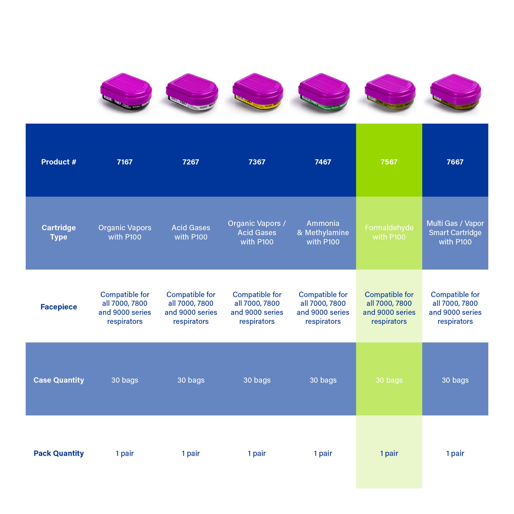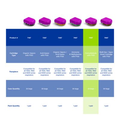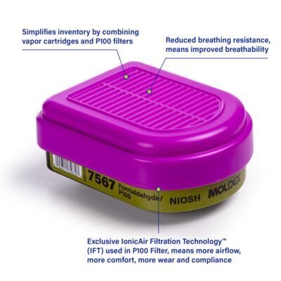 Meet the Moldex 7567 Formaldehyde Cartridge/P100, part of the 7067 Series. We’ve combined our cartridges and filters into a fully integrated, easy-to-attach unit that delivers maximum convenience and broader-based protection across a wide variety of hazardous environments. Our proprietary IonicAir Filtration Technology® (IFT®) in the P100 filters provides more airflow for reduced breathing resistance, improved breathability, class-leading comfort, longer wear, and better compliance. Each cartridge also includes a cover for splash and spark protection, and all Moldex filters and cartridges are 100% Made in America.