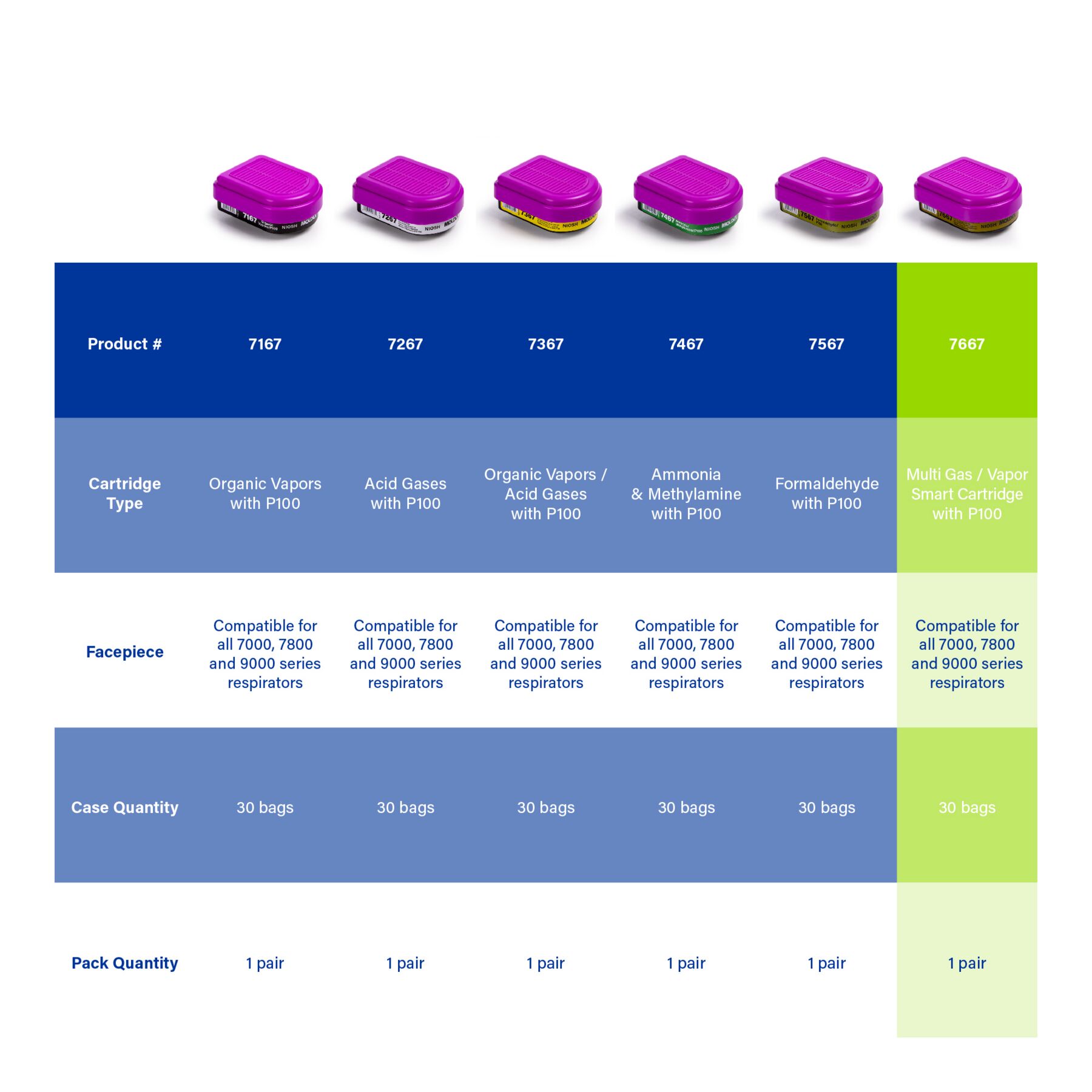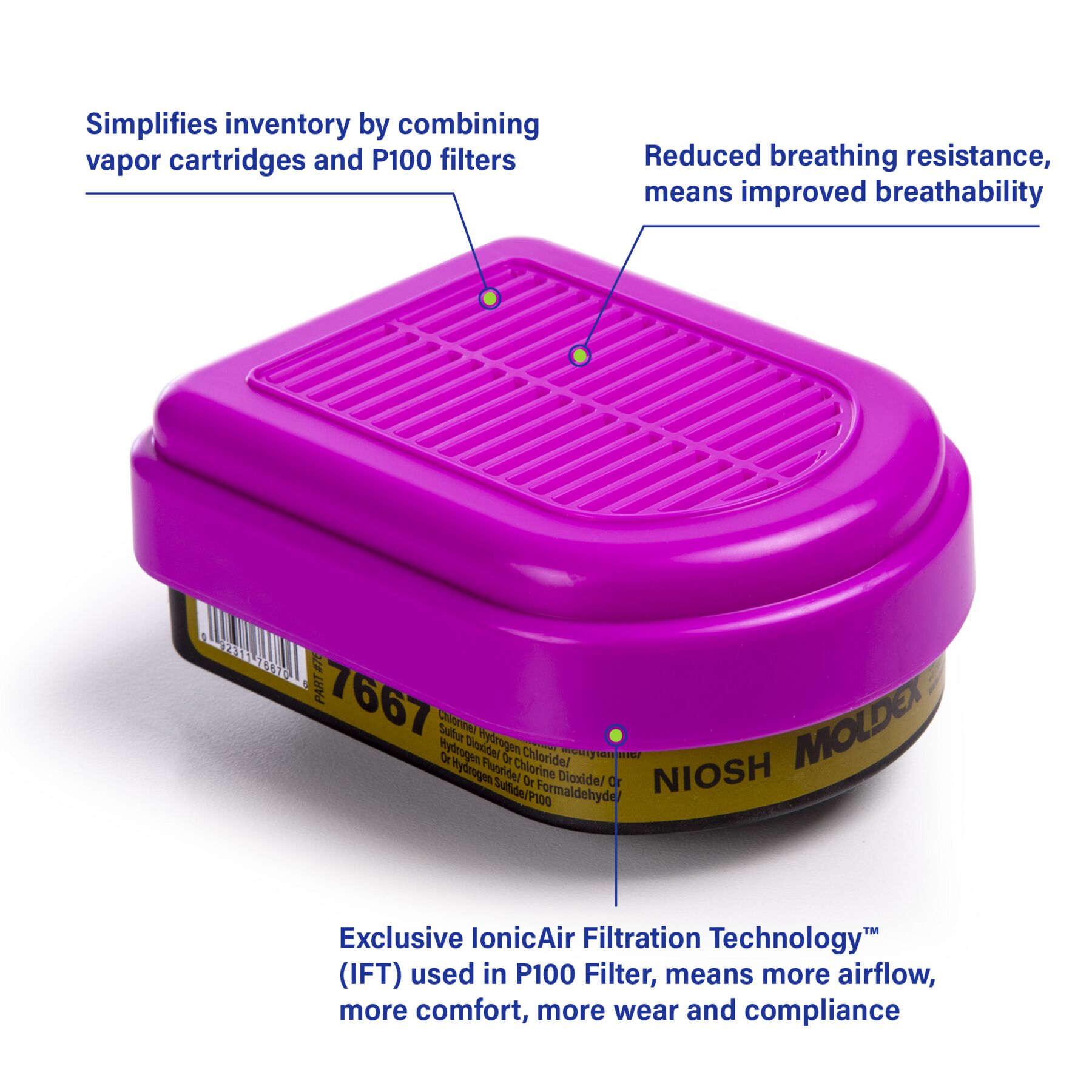 Meet the Moldex 7667 Combo Multi-Gas/Vapor Smart Cartridge/P100, part of the 7067 Series. Approved for nine common gas/vapors. Replaces up to five gas/vapor cartridges. We’ve combined our cartridges and filters into a fully integrated, easy-to-attach unit that delivers maximum convenience and broader-based protection across a wide variety of hazardous environments. Our proprietary IonicAir Filtration Technology® (IFT®) in the P100 filters provides more airflow for reduced breathing resistance, improved breathability, class-leading comfort, longer wear, and better compliance. All Moldex filters and cartridges are 100% Made in America.