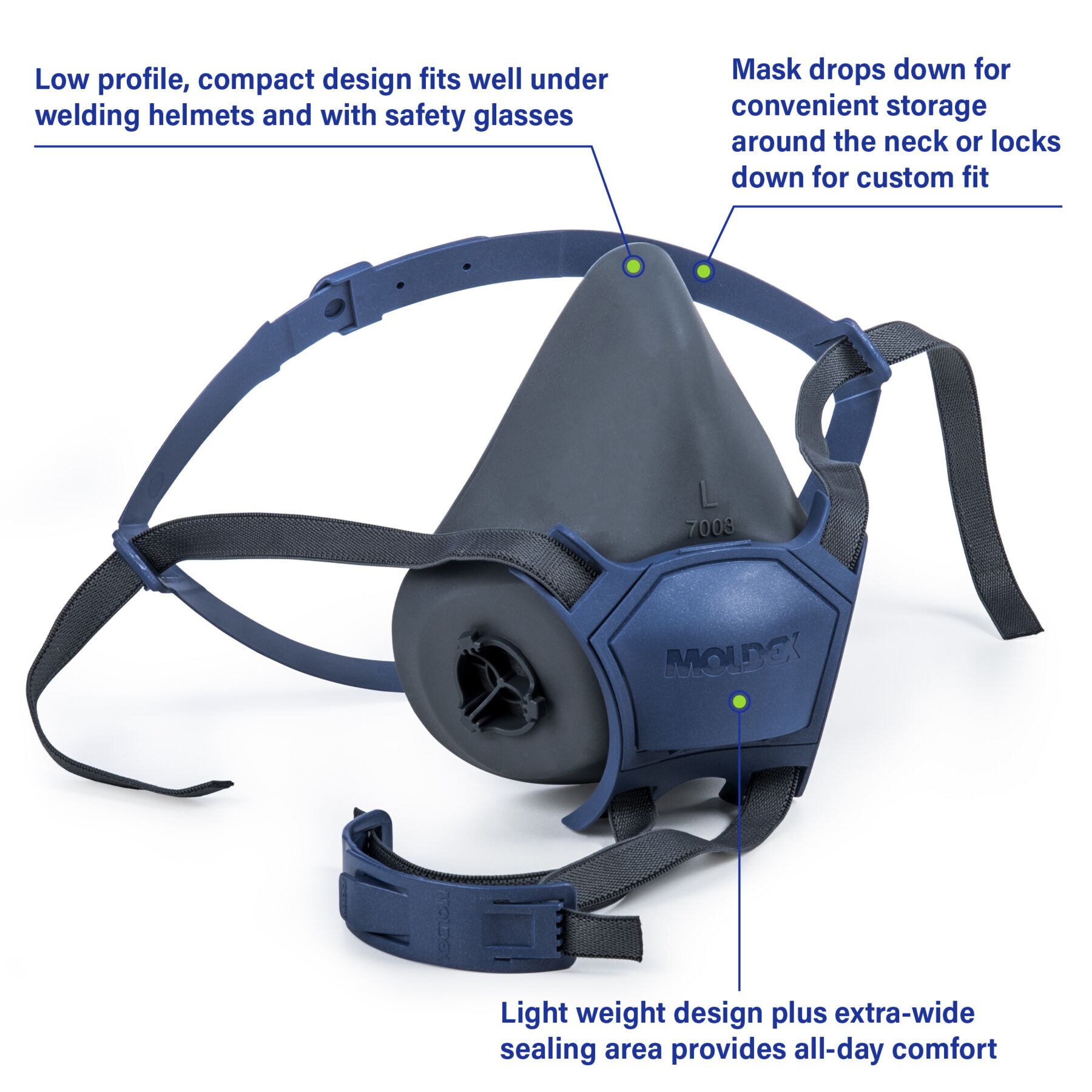 Meet the Moldex® 7000 Series Reusable Half Mask Respirator. Designed for protection. Built for comfort. We designed the 7003 facepiece to be the most user-friendly respirator on the market. This respirator features fewer parts, minimal easy maintenance, and a wider field of vision. Easy mount bayonet cartridge/filter attachment. Adjustable head harness for a custom fit. It is ultralight weight, durable, and economical. The results? Simple, comfortable and economical respiratory protection that’s just plain easy to wear.